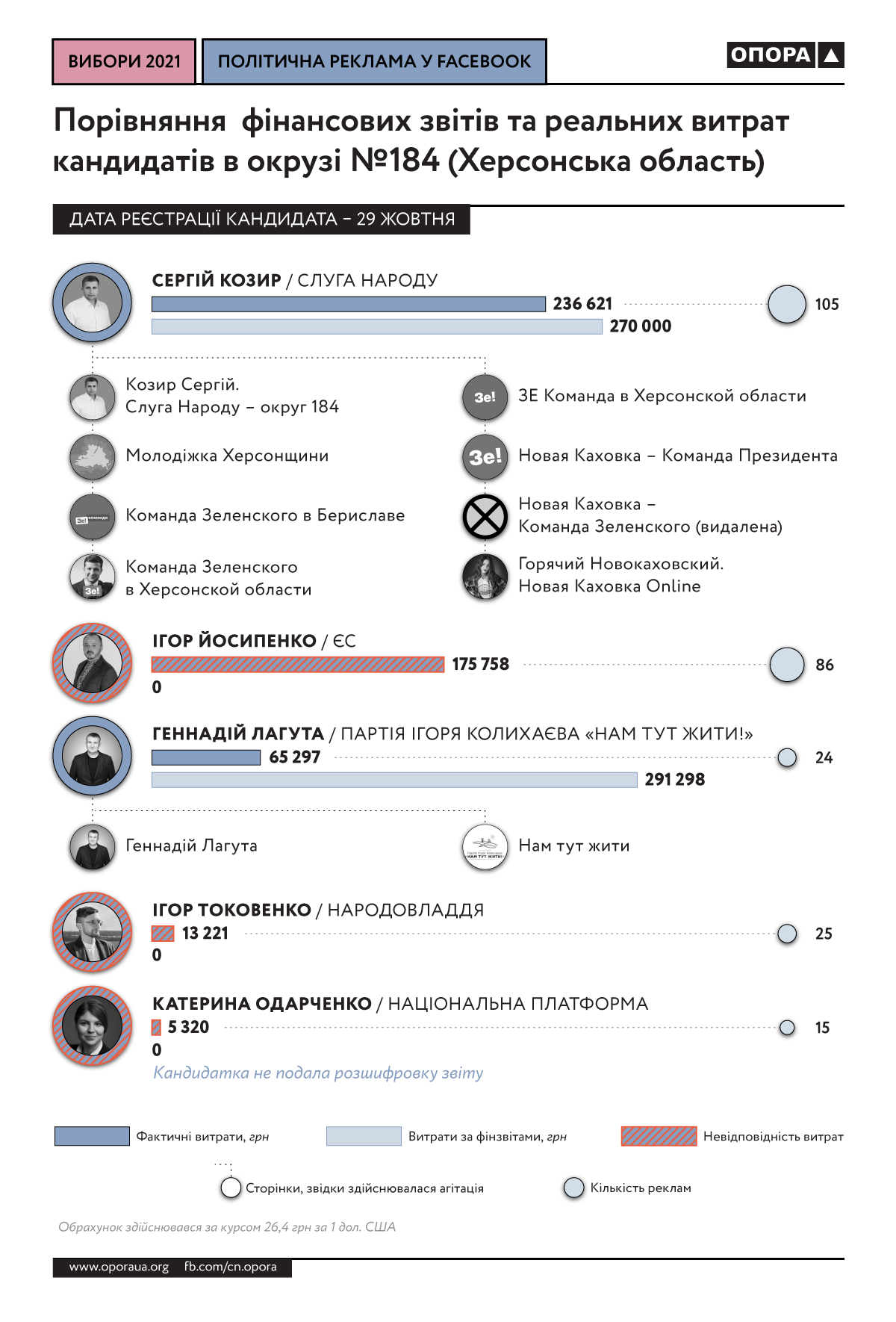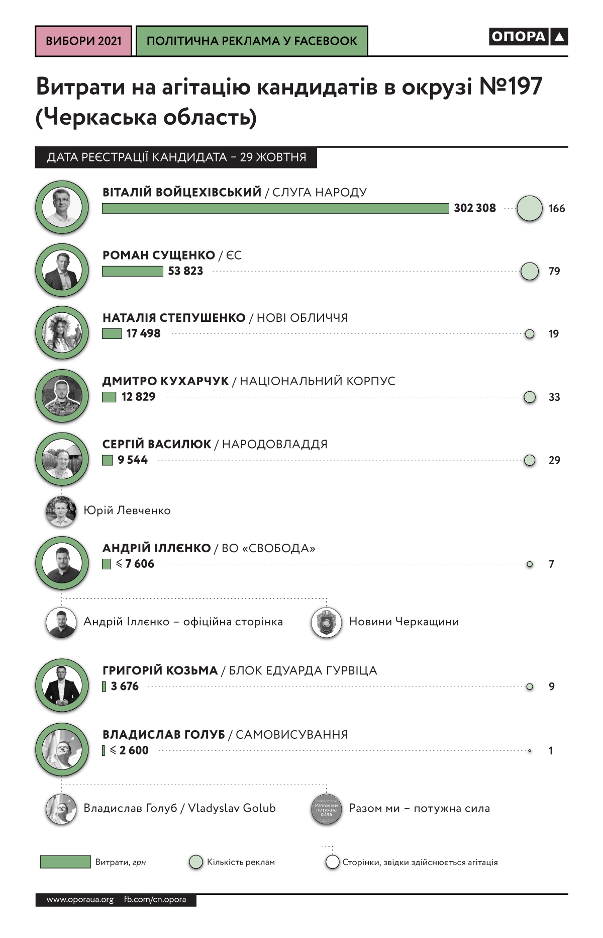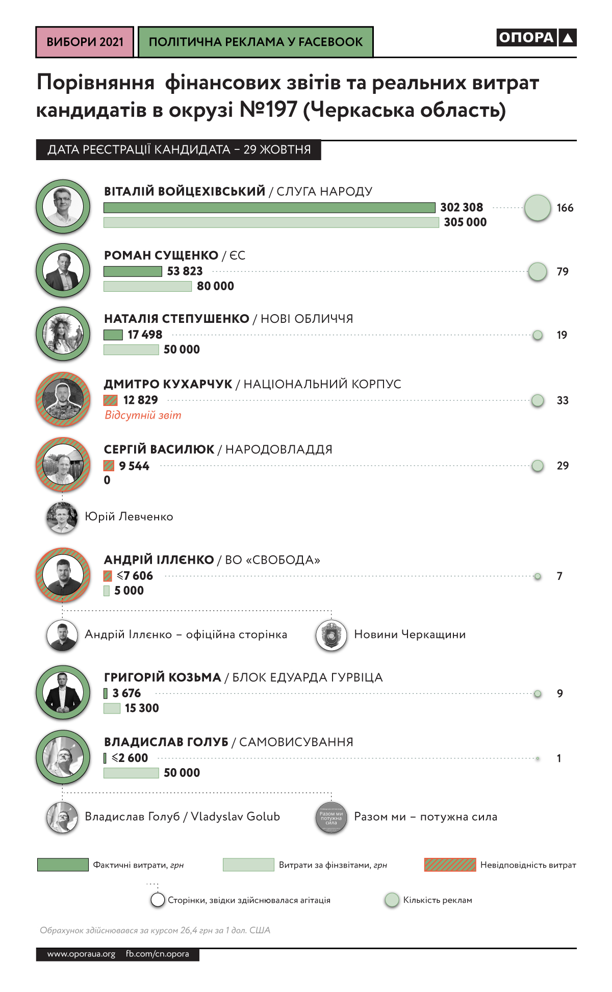 Нижче на інфографіках зображено порівняння витрат, зазначених у фінансових звітах кандидатів, із їхніми фактичними видатками на онлайн-агітацію в мережі Facebook.