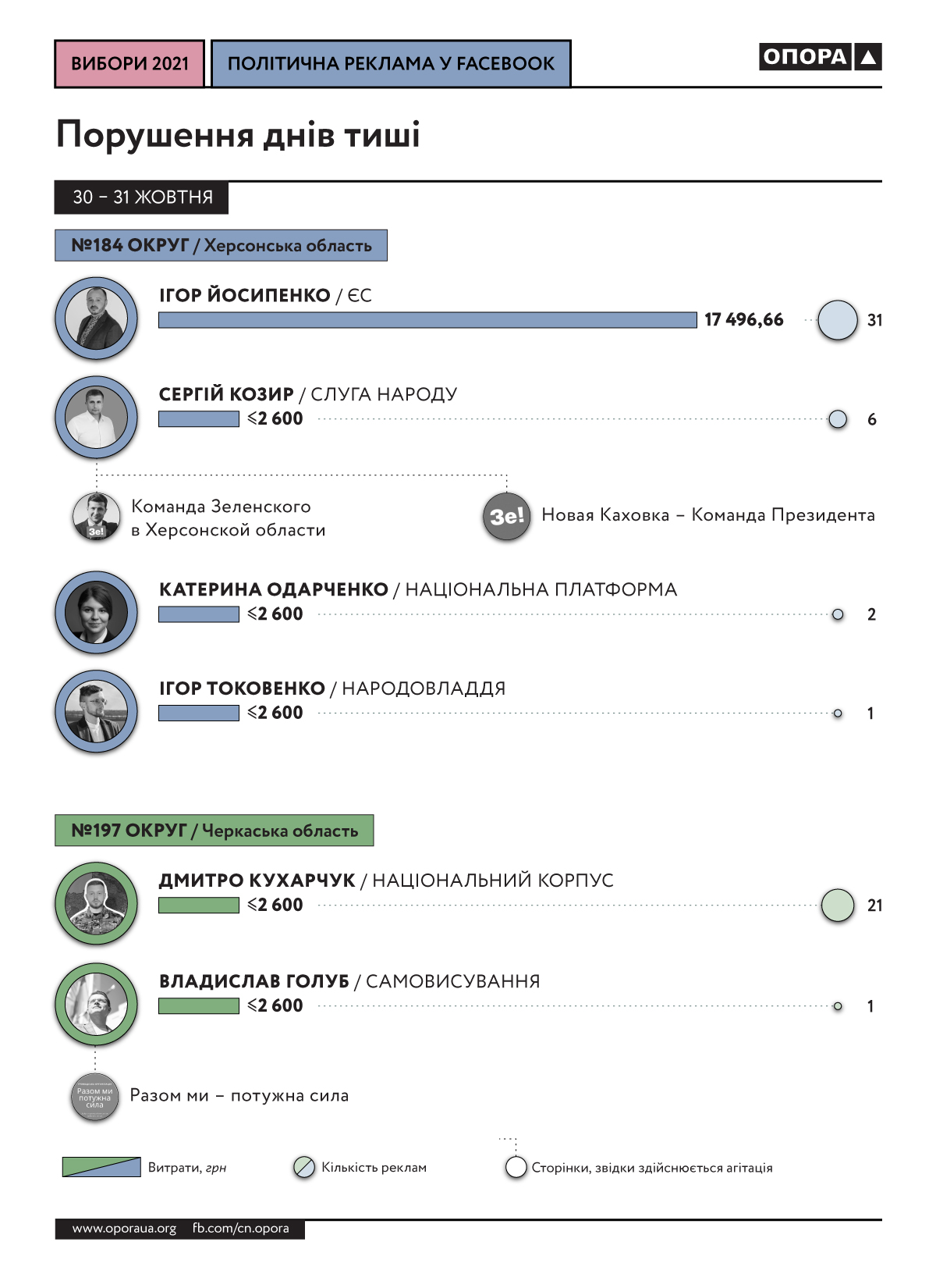 Під час моніторингу ОПОРА зафіксувала також порушення заборони агітувати у “дні тиші” у Facebook з боку 6 кандидатів. Очолив цей антирейтинг кандидат від “Європейської солідарності” у 184 окрузі Ігор Йосипенко, який витратив понад 600 доларів США (близько 17 500 грн) на 31 рекламний допис у день та переддень виборів. Інші кандидати, хоча й теж проігнорували законодавчу заборону на проведення агітації, у “дні тиші” витратили значно менше — їхні витрати не перевищували 100 доларів. На жаль, бібліотека реклами Facebook не надає точних даних про витрати, які не перевищують 100 доларів США, тому точна сума витрачених на рекламу коштів перебуває у проміжку між 1 та 2600 гривень.