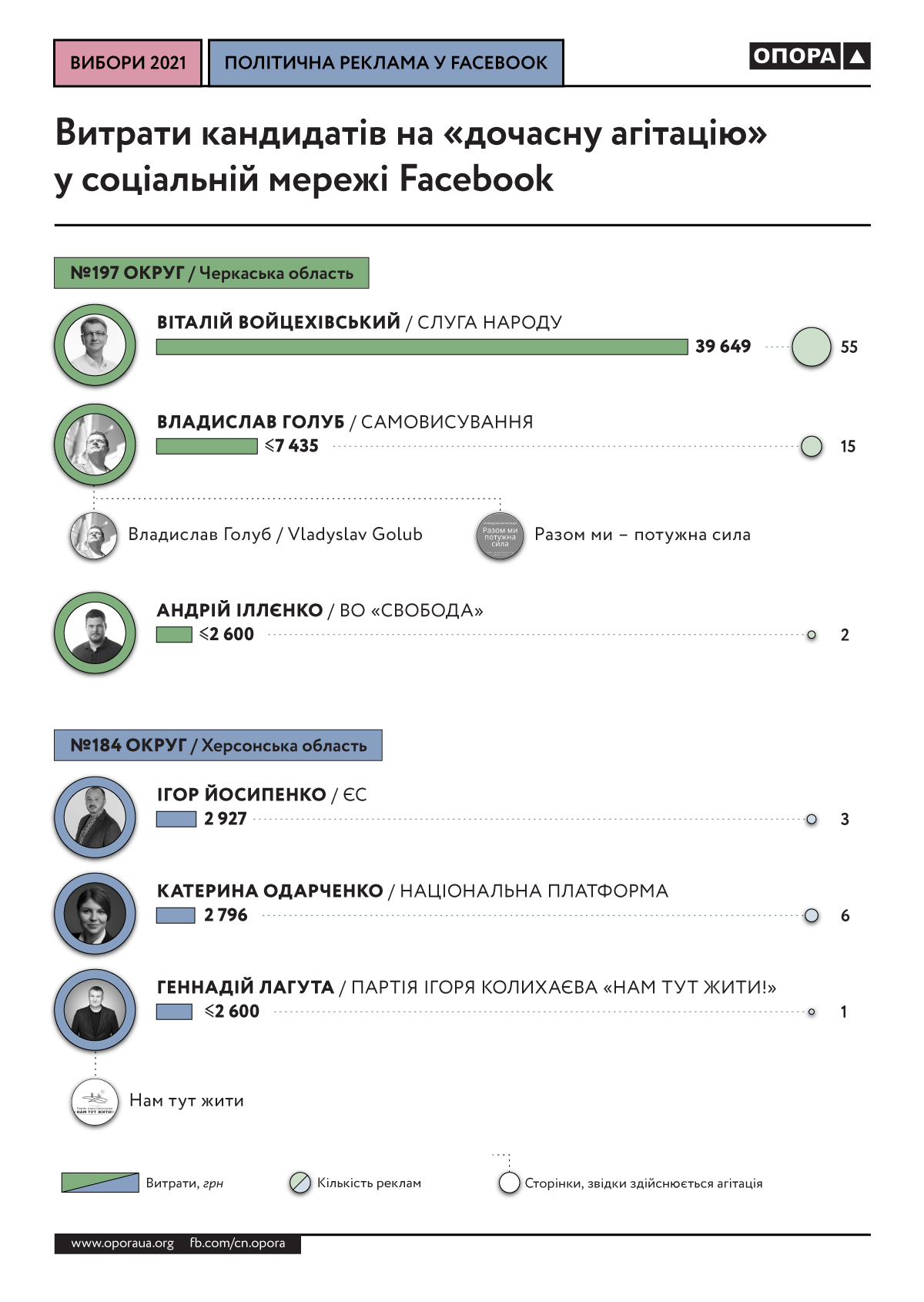 На інфографіках зображено витрати усіх кандидатів на агітацію в соціальній мережі Facebook, а також загальну кількість опублікованих оголошень та сторінки, з яких відбувалася агітація.