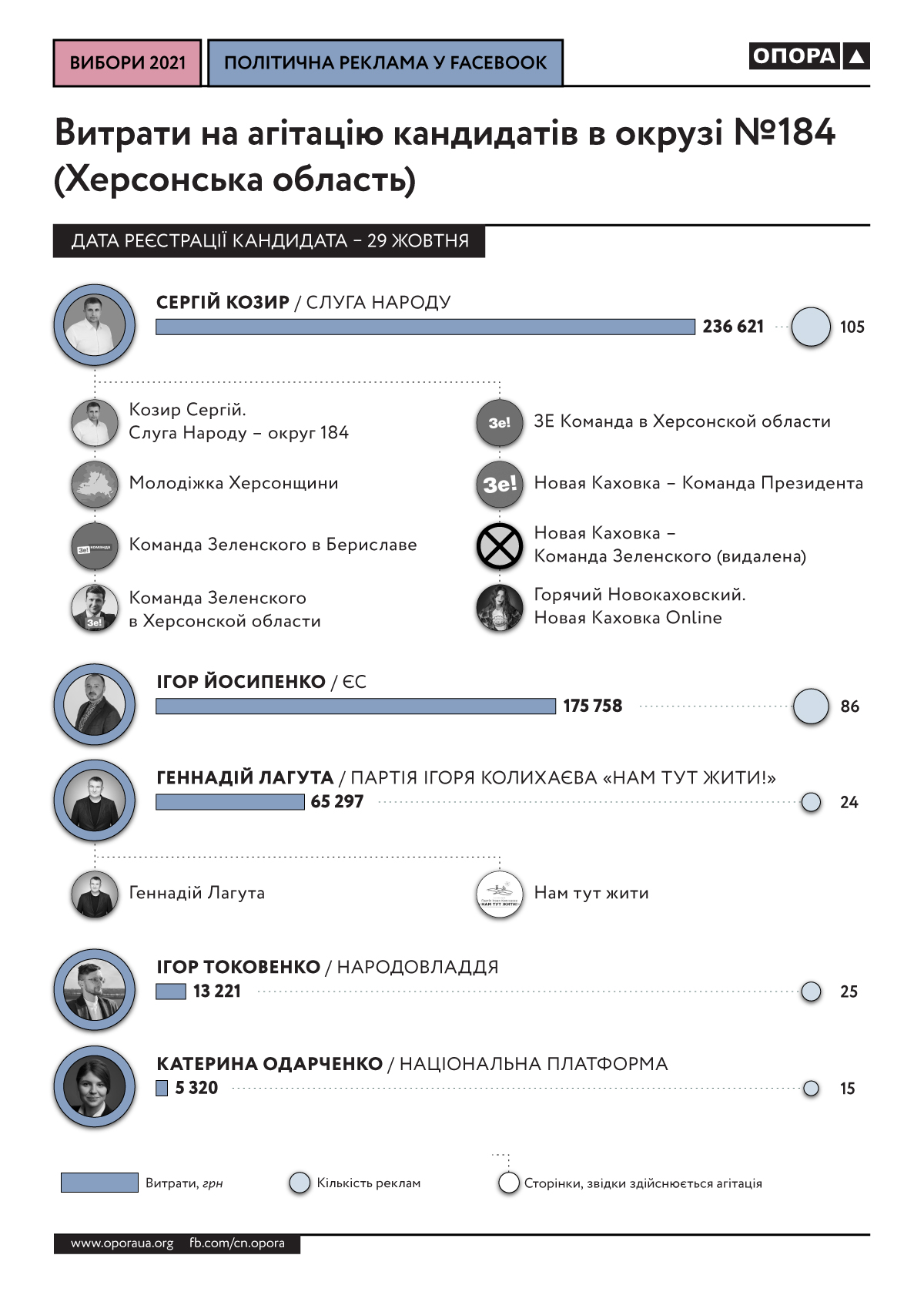 Найбільшу кількість коштів, майже 40 тисяч гривень, на дочасну агітацію витратив кандидат від партії “Слуга Народу” Віталій Войцехівський. Окрім нього, дочасну агітаційну кампанію в соціальних мережах розгорнули Владислав Голуб (витратив 7 500 гривень) та висуванець від партії ВО “Свобода” Андрій Іллєнко. В 184 виборчому окрузі дочасні агітаційні кампанії в інтернеті розгорнули також три кандидати — Ігор Йосипенко (“Європейська Солідарність”), Катерина Одарченко (“Національна платформа”) та Геннадій Лагута (партія Ігоря Колихаєва “Нам тут жити”). Їхні витрати не перевищили 3000 гривень.