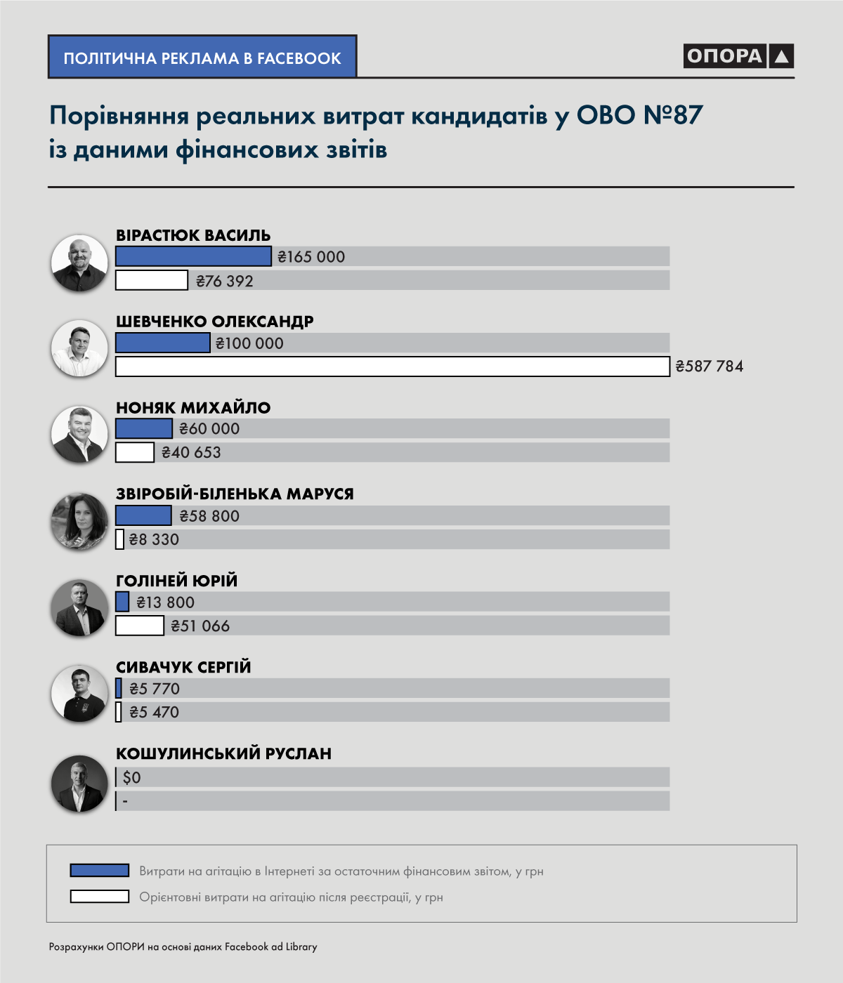 Наприкінці квітня ОПОРА проаналізувала остаточні фінансові звіти кандидатів у народні депутати на довиборах у окрузі 87, які відбулися 28 березня. Тоді аналітикам ОПОРИ вдалося помітити, що в діях кандидатів Юрія Голінея й Олександра Шевченка та осіб, котрі замовили рекламно-агітаційні повідомлення на їхню користь в соціальній мережі Facebook, наявні ознаки порушення виборчого законодавства.
