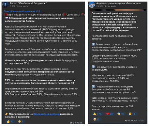 - приклади й цитати, які буцімто підтверджують майже одностайне прагнення мешканців ТОТ приєднатися до Росії. Крім типових цитат начебто типового жителя ТОТ, у яких змальоване нетерпіння та «щире бажання» приєднатися до Росії, окупанти намагаються доповнити ілюзію звичного агітаційного процесу даними: наводять результати «досліджень» кримського республіканського інституту політичних та соціологічних досліджень і Мелітопольського державного університету імені Макаренка.