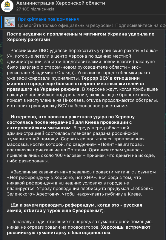 - інформування про устрій медичної, адміністративної, освітньої та інших систем РФ. Цей наратив створює ілюзію «інформованого вибору» жителями окупованих територій російської системи соціальних послуг. Окупанти доповнюють пропагандистські матеріали деталями про те, як зміниться життя людей після насадження цієї системи (звісно ж, «на краще»). При цьому такі начебто «просвітницькі» дописи часто супроводжуються закликами обрати цей варіант майбутнього, взявши участь у псевдореферендумі.