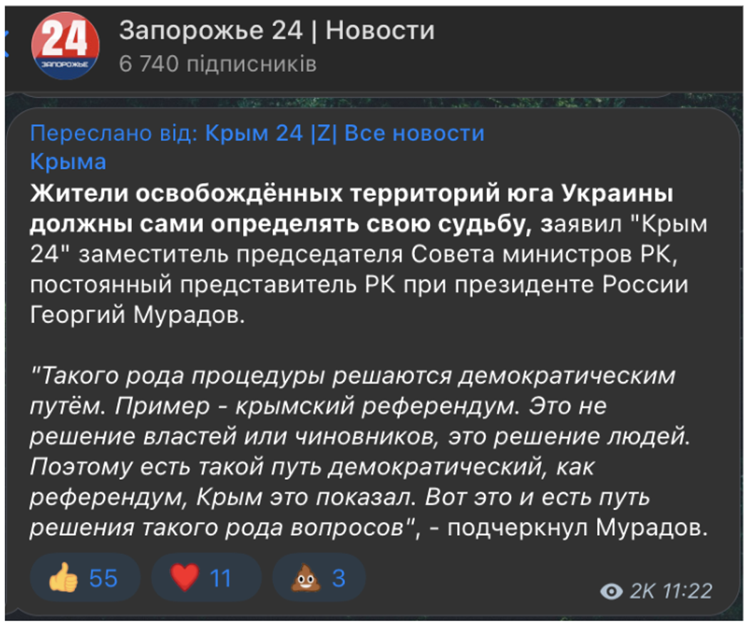 Для мавпування агітаційного процесу перед так званим волевиявленням окупанти використовують добре знайомі нам наративи Так, для легітимації псевдореферендумів бачимо такі обґрунтування: