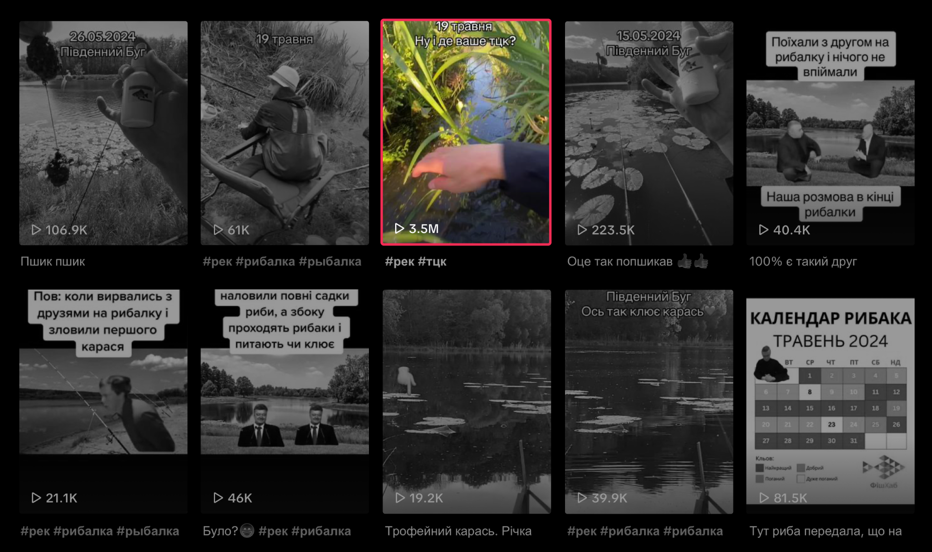 Джерело: texty.org.ua. Сторінка про риболовлю, ролики на якій збирали максимально 300 тис. (а зазвичай 10–20 тис.) переглядів, публікує жартівливе відео з очерету з текстом “19 травня. Ну і де ваше ТЦК?”. І отримує 3,4 млн глядачів. На відео з #ТЦК пробирається по воді крізь очерет. Озвучка (скорочено): “Сьогодні 19 травня, іду по хліб. Усі кричать: ТЦК, ТЦК. Та нема тут ніякого ТЦК”
