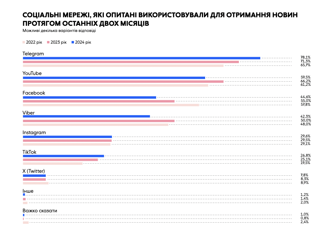 Аналітикиня цифрових платформ Громадянської мережі ОПОРА Ольга Снопок розповіла про те, які соціальні мережі використовують українці на третьому році повномаштабної війни (на основі свіжого соціологічного дослідження). Так, 26,8% опитаних читають новини у тікток. Тікток чоловіки (26,3%) та жінки (27,2%) використовують для отримання новин приблизно однаково. Серед молоді (18–29 років) помітно зростає популярність тікток (на понад 9% за останній рік — до 34,3%). Серед авдиторії віком від 30 до 39 років тікток як джерело новин дещо втратив популярність — цьогоріч ним користуються 20,6% опитаних цього віку, минулого року — 24,7%. Респонденти віком від 40 до 49 років використовують тікток (26,2%) для отримання новин співмірно із попереднім роком. Опитані віком від 50 до 59 років використовують для отримання новин тікток (27,9%) дещо рідше. Серед авдиторії 60-69 років тікток використовують лише чверть респондентів. Серед літніх людей (від 70 років) 30,3% використовують тiктoк. Тiктoк є джерелом новин здебільшого для мешканців сільської місцевості: 30,9% (проти 25,1% у містах).