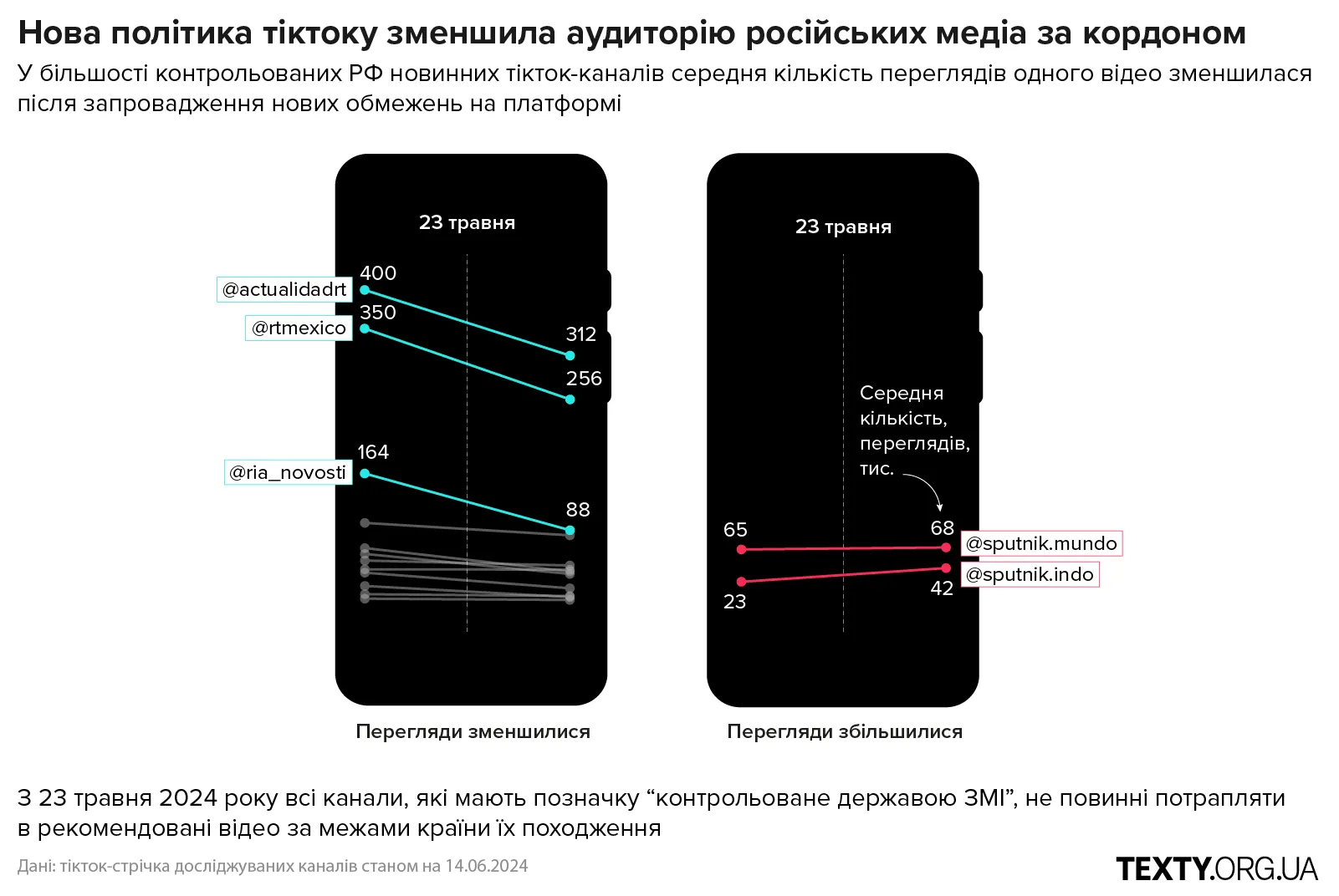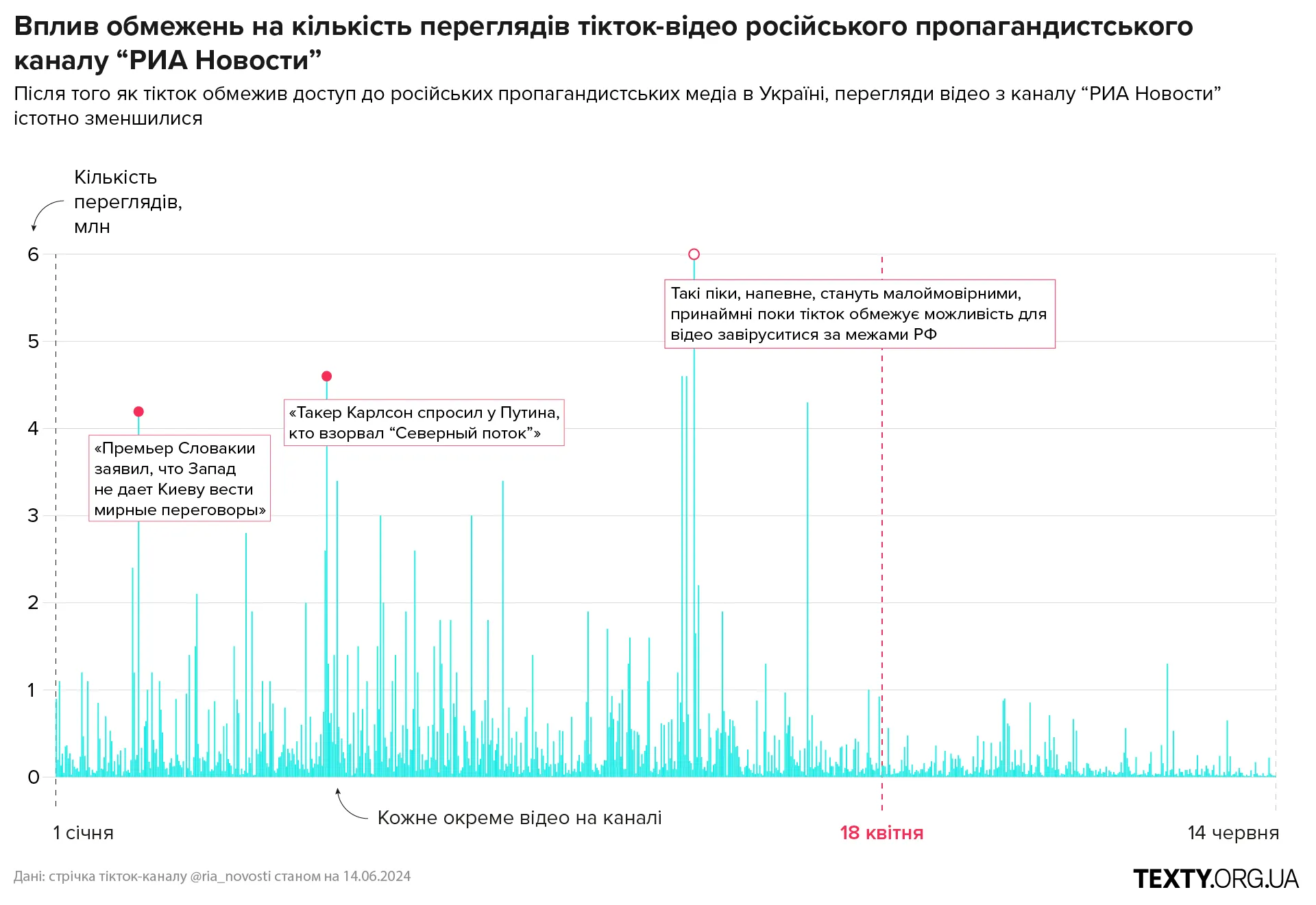 "Тікток дуже хитро підходить до своєї політики модерування контенту, — каже Ольга Снопок. — Важливо, що тікток у своїй політиці фокусується на блокуванні каналу, а не на блокуванні контенту. Тому так, він може обмежити показ "Россія 24" або "Ріа Новості" в Україні, наприклад, але навіть мені в тіктоці трапляються проросійський або відверто російський контент, який поширюють десятки ноунейм акаунтів. А тіктоку на це в принципі всеодно. Наприклад, ми виявили каналів 10-15, які методично щоденно просували відео Юрія Подоляки (проросійський журналіст, який ще у 2014 році виїхав до Росії і звідти записує свої пропагандистські ролики про “СВО”). Півроку тому він позиціонував себе як воєнний оглядач і кожного дня записував відео про те, що відбувається на фронті. І тіктоку в принципі було окей, що цей контент із хейтспічем і тд існує на платформі, а також просувається десятками різних каналів. Так само Росія вчиняє й з іншим пропагандистським контентом: якщо падають покази у основних каналів, це взагалі не означає, що загальні покази цього piece of contect (шматочка контенту) насправді впали. Можливо, вони просто розосередились на інші канали".