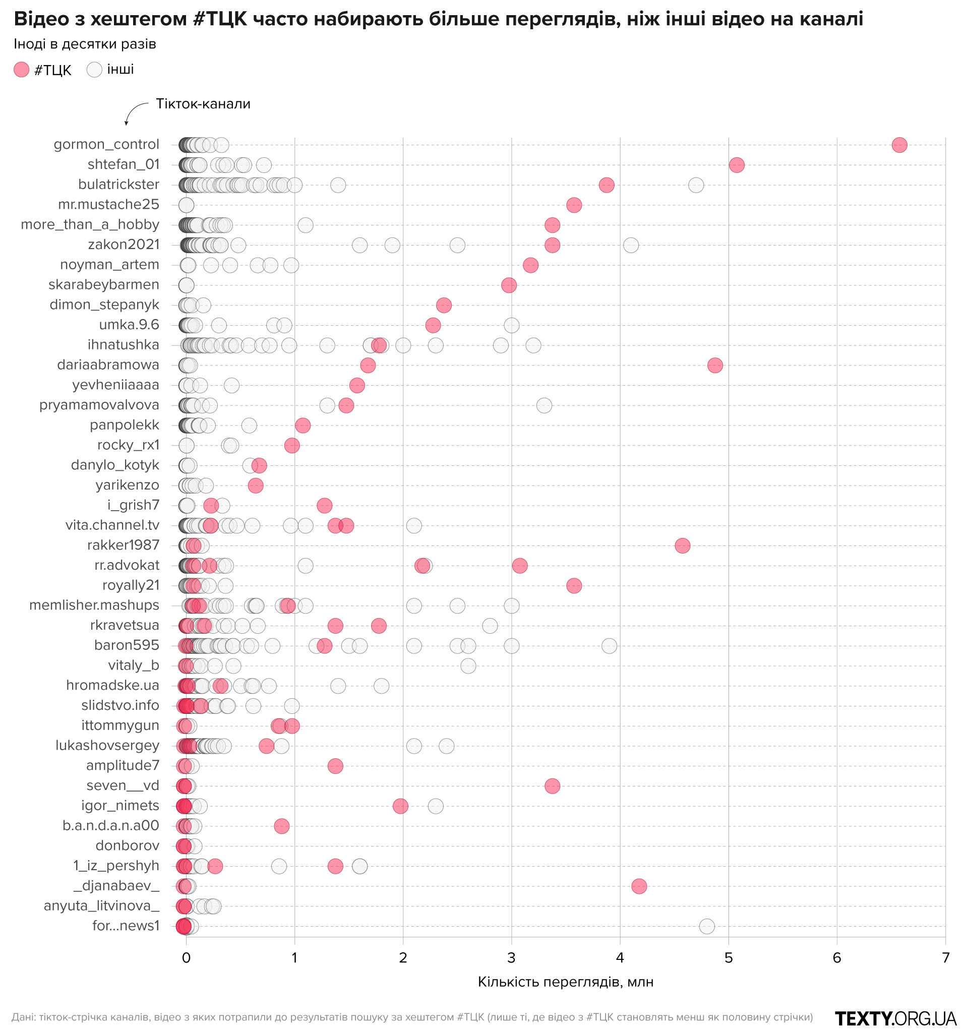Юлія Дукач, керівниця проєкту дослідження дезінформації в Texty.org.ua., розповіла, що у тіктоці пошук алгоритмічний. А отже, шукаючи там відео на якусь тему, ви отримуєте не найпопулярніші, а ті, які платформа радить до перегляду, себто збірну солянку від найпопулярніших відео блогерів-мільйонників до випадкових свіжих роликів, які тікток поки що тестує на потенційну віральність. До прикладу досліджниця наведа дані червневого дослідження їх команди. Так, лише в червні в українському тіктоці відео з хештегом #ТЦК набрало 470 млн переглядів (3 млрд за весь час). Тоді ж упродовж місяця опублікували 13 тис. постів із цим хештегом (62 тис. за весь час). Це перший за популярністю хештег у категорії “Новини і розваги”. І на нього дедалі частіше можна натрапити на сторінках тіктокерів, які, здавалося б, до теми ТЦК та мобілізації взагалі не дотичні. А все тому, що ця тема забезпечує в рази більше переглядів.