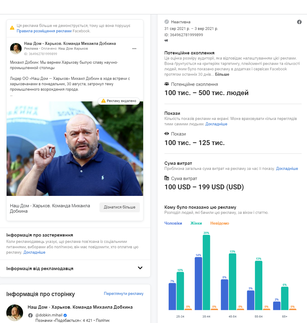 У серпні вперше до десятки найщедріших рекламодавців потрапила сторінка Наш Дом - Харьков. Команда Михаила Добкина, створена 11 серпня 2020 року (вочевидь, напередодні попередньої кампанії місцевих виборів). Михайло Добкін ще 1 січня анонсував намір балотуватися на посаду Харківського міського голови. 3215 американських доларів на сторінці було інвестовано у промоцію публікацій про ті зміни, які чекають на Харків у майбутньому, а також “ініціативи лідера громадської організації “Наш Дом Харьков” Михайла Добкіна, які почали діяти у місті влітку. Вся реклама на сторінці політика транслюється російською мовою. Оплачує промоцію Наш Дом Харьков. Саме на цій сторінці в серпні транслювалася найдорожча реклама — сумарні витрати на дві публікації 1500 - 2000 доларів. Водночас трансляція однієї з публікацій на сторінці була зупинена через порушення правил розміщення від Facebook.
