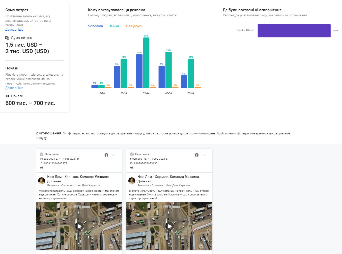 Минулого року такі значні витрати були викликані стартом у вересні офіційної кампанії місцевих виборів. Тоді помітно наростили свою діджитал-присутність та стали вкладати великі гроші в онлайн-піар сторінки політичних партій. Цьогоріч теж спостерігається така тенденція — у мережі досить активно ведуться рекламні кампанії претендентів на кандидування у Харкові. Як і в липні 2021 року, найбільше політичної реклами таргетується на користувачів з цього регіону.