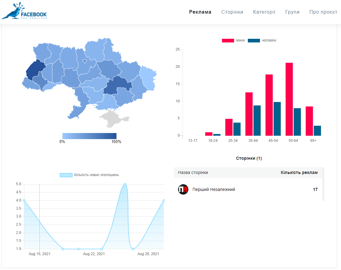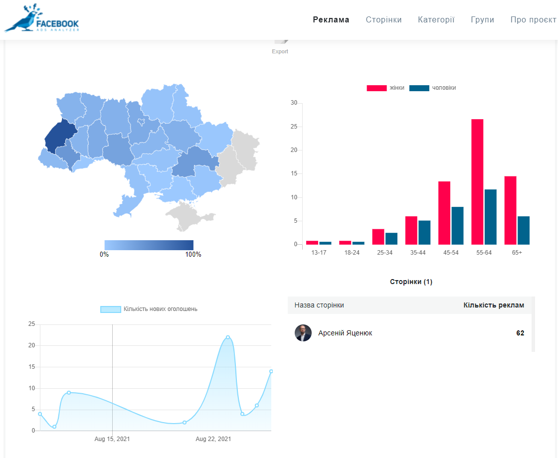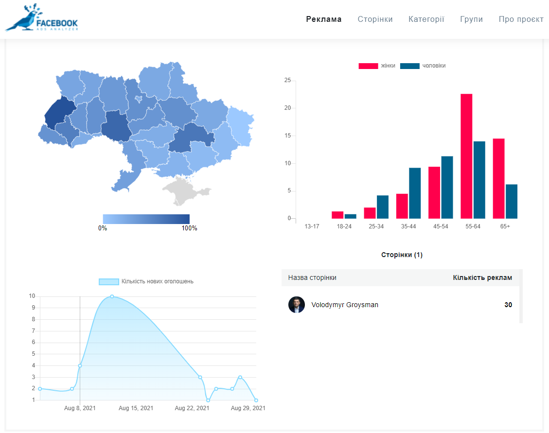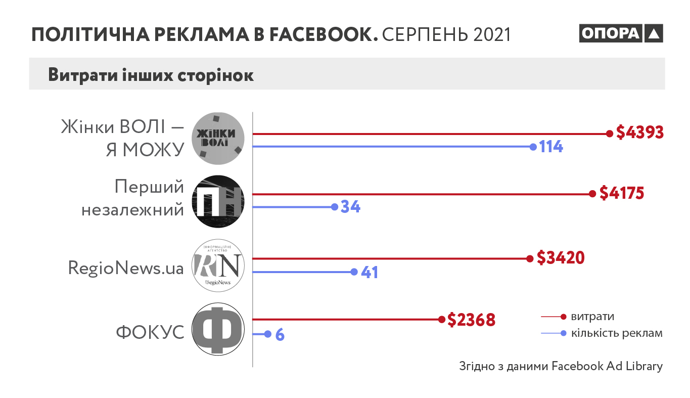 Хоча у серпні найбільше, відповідно до даних Facebook Ad Library Report, витратив на рекламу в соцмережах — Олександр Шевченко. Позаяк вся реклама на його сторінці стосувалася ініціативи зі збору коштів на допомогу дитині, яка має рідкісне генетичне захворювання, цього місяця ми виключили сторінку політика із рейтингу тих, хто найбільше інвестує в онлайн- просування.