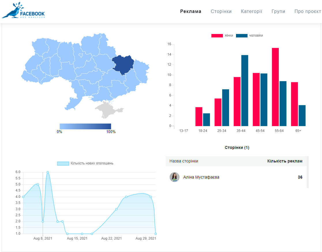 Майже 4 тисячі доларів у серпні було інвестовано у політичну рекламу на сторінці депутатки харківської міської ради від партії “Слуга народу” Аліни Мустафаєвої, яка заявила про свій намір балотуватися на виборах міського голови Харкова. У частині дописів вона позиціонує себе як висуванку від політичної партії “Слуга народу” та проводить опитування щодо своєї підтримки у порівнянні зі ще двома потенційними учасниками виборчих змагань Ігорем Тереховим та Михайлом Добкіним. Також Мустафаєва закликає підписників слідкувати за її блогами в інших соціальних мережах.
