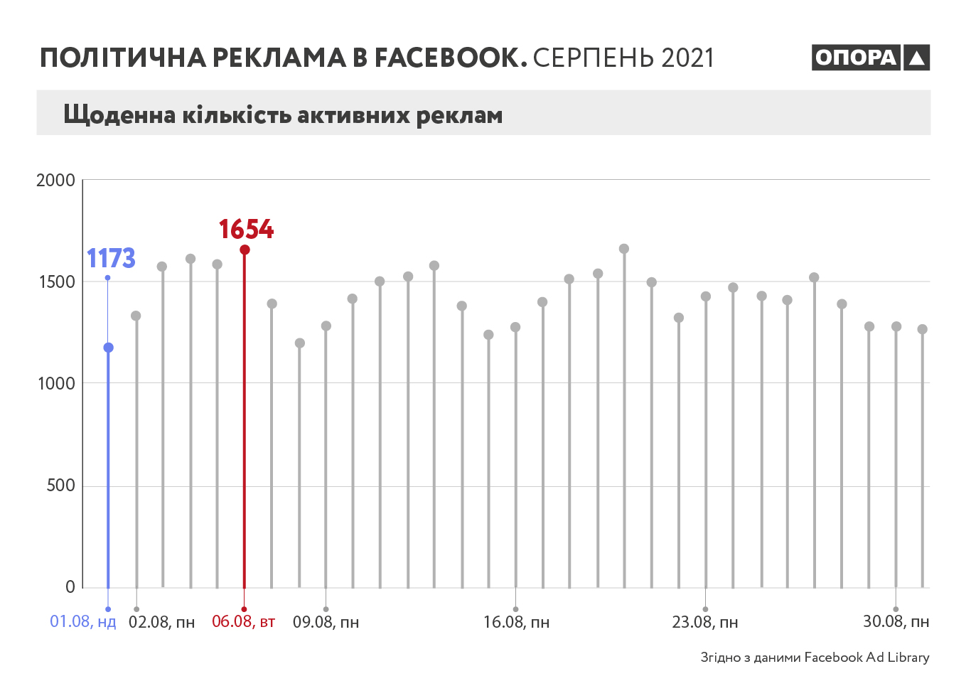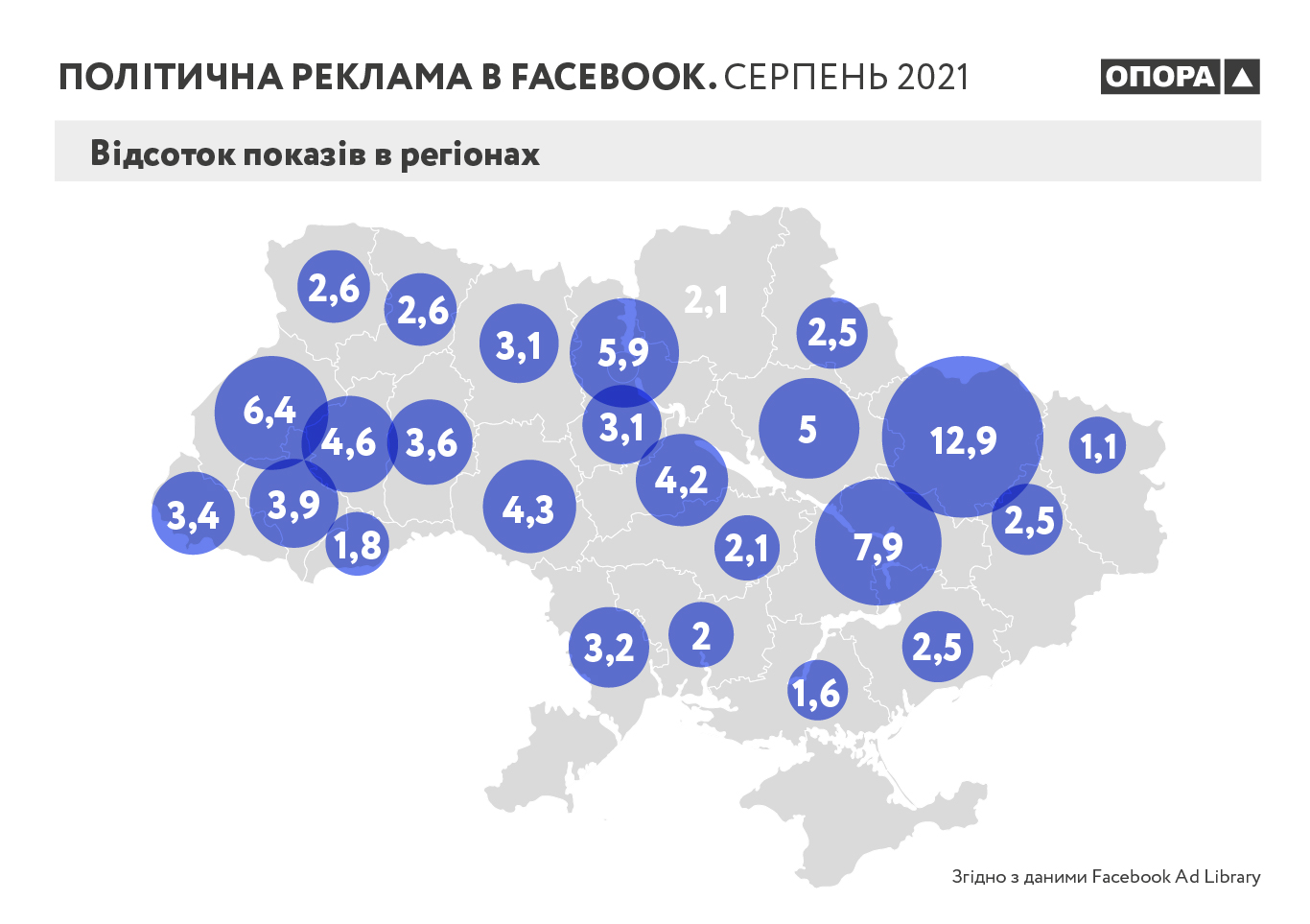 ** Оскільки Бібліотека політичної реклами пропонує 30-денний діапазон дат для отримання і завантаження даних, які зберігаються в сховищі, то моніторинг політичної реклами в Facebook, який здійснила ОПОРА, включає дані за 30.01.2021 – 28.02.2021.