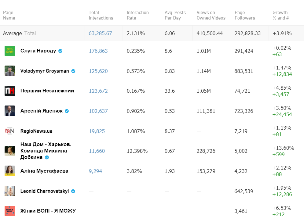 Відповідно до даних інструменту Crowdtangle, найбільше реакцій та коментарів у серпні користувачі залишили під постами на сторінках партії “Слуга народу”, Володимира Гройсмана та Першого незалежного. Але у відсотковому співвідношенні “взаємодії — кількість підписників” найкращий результат має сторінка Наш Дом — Харьков. Команда Михаила Добкина. На останній відбувся найбільший приріст кількості фоловерів за цей період.