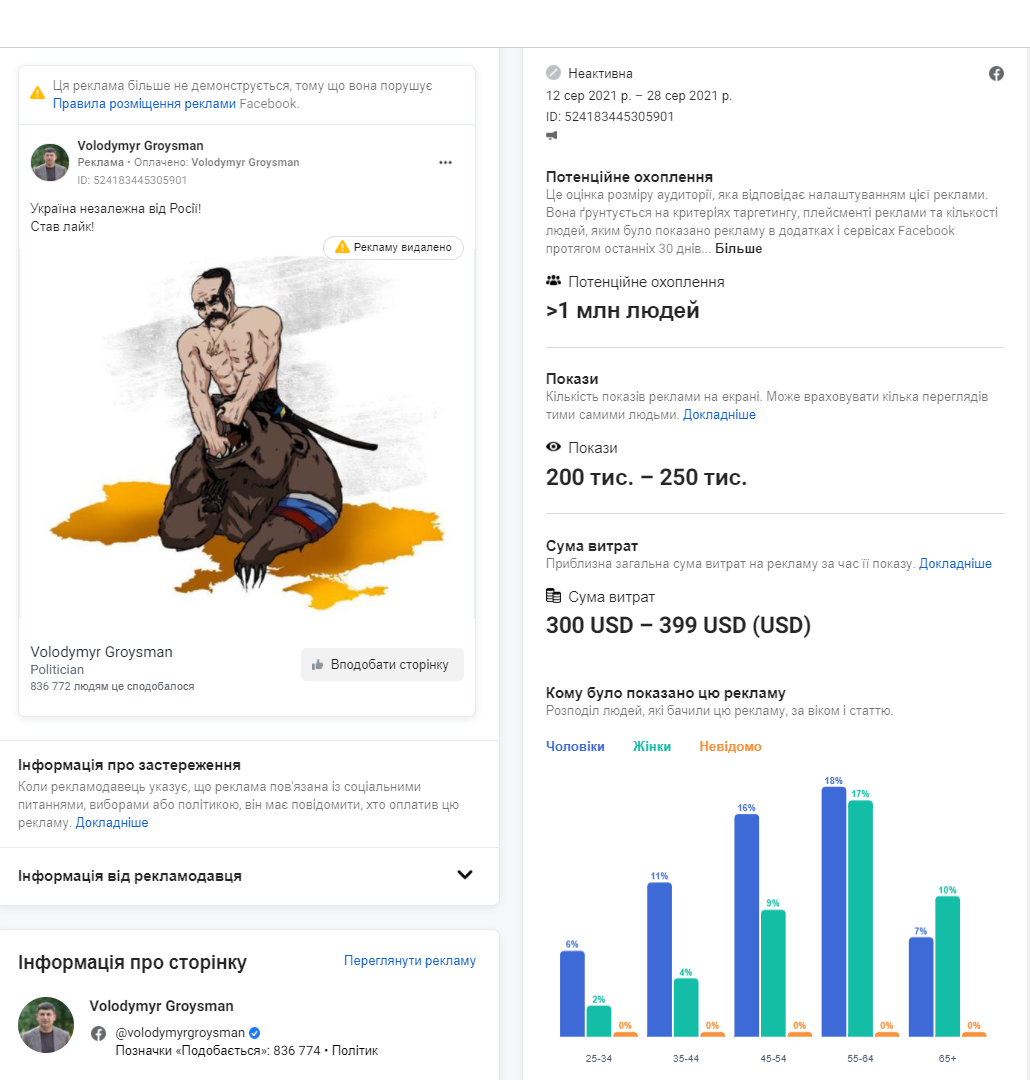 Просувала “народне голосування” щодо 100 сучасників, які змінили Україну, сторінка журналу “Фокус”. Витрати на промоцію у серпні склали 2368 американських доларів.