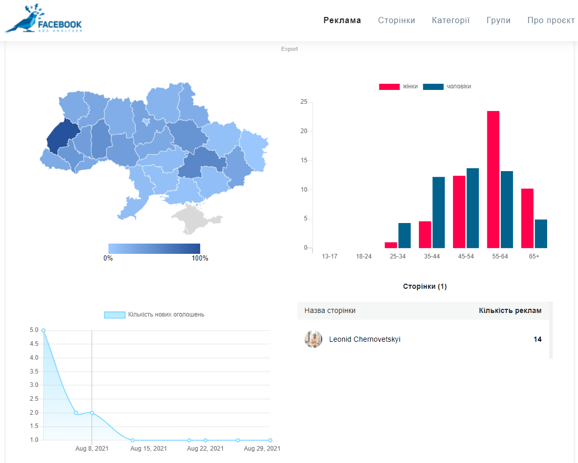Використовував інструмент політичної реклами для просування власного YouTube-каналу, книги, а також благодійного фонду колишній міський голова Києва Леонід Черновецький. Всі рекламні пости — відеоблоги Черновецького зі “спогадами” про українську політику. Рекламний контент таргетується на всі регіони України, із більшим відсотком показів для користувачів із Львівщини.