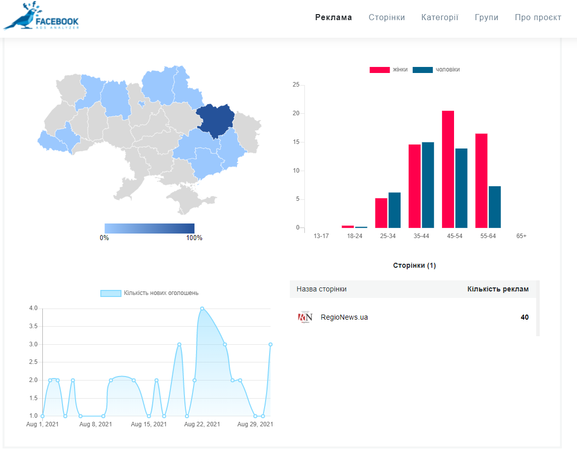 Активно використовує можливості реклами у соцмережах сторінка всеукраїнського видання RegioNews.ua. 91% — саме такий пріоритет для рекламодавців становили користувачі з Харківщини. На рекламу всіх постів у серпні було витрачено 3420 доларів. Більша частина дописів — про політичну боротьбу в Харкові, де із позитивної сторони висвітлюються ініціативи та позиції потенційного учасника змагань за крісло міського голови Михайла Добкіна, і водночас критикується його суперник Ігор Терехов.