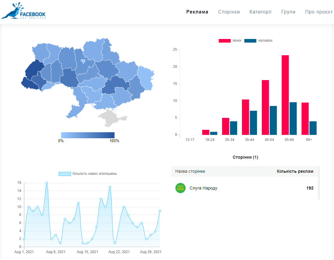 Найбільше політичної реклами у серпні “замовила” сторінка партії “Слуга народу”, витративши на промоцію 4708 доларів. У публікаціях на сторінці багато уваги присвячується молодіжному з'їзду партії; вітають українців з Днем Незалежності; пояснюються позиції партійців щодо політичних питань та законодавчих ініціатив; поширюються відеоблоги за участі представників партій. Найбільше політичної реклами зі сторінки демонструвалося для користувачів із Львівської та Закарпатської областей.