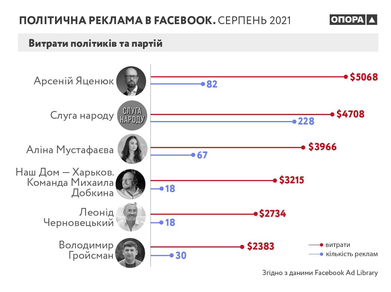 * Оскільки Facebook Ad Library report не подає точної інформації про вартість політичної реклами, якщо вона не перевищила 100 $, то при аналізі витрат рекламодавців отримуємо дві суми – мінімальну та максимальну.