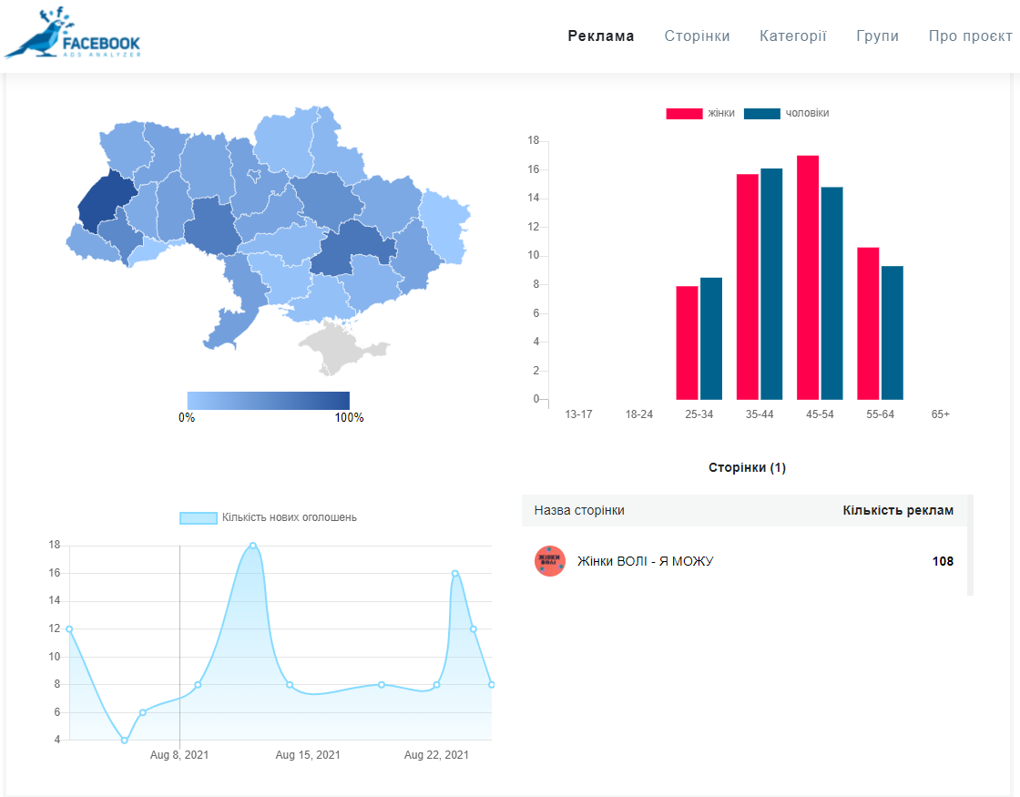 4 393 доларів — саме стільки сягнули витрати на рекламу зі сторінкиі однієї із ініціатив політичної партії Воля “Жінки ВОЛІ - Я МОЖУ”. Просуваються на сторінці освітні курси від ініціативи. Але таргетується реклама як на жіночу, так і на чоловічу аудиторію рівною мірою. Переважають покази для користувачів із Львівщини, Дніпропетровщини, Вінниччини. Оплачує промоцію Ольга Ситник — членкиня ради партії “Воля” та засновниця громадської організації “Жінки ВОЛІ” та жіночого рух “Я МОЖУ!”.