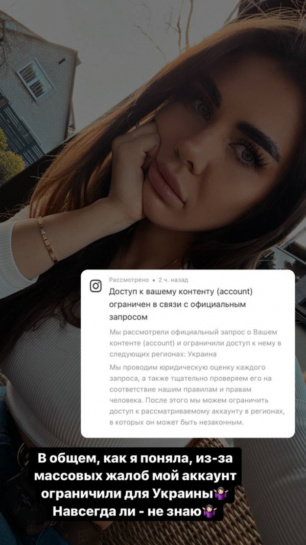 Наприклад, під обмеження потрапила блогерка Софія Стужук, яка повідомила про блокування у своєму Telegram-каналі. До того ж блогерка розмістила повідомлення, яке отримують усі, чия Instagram-діяльність обмежена на території України.