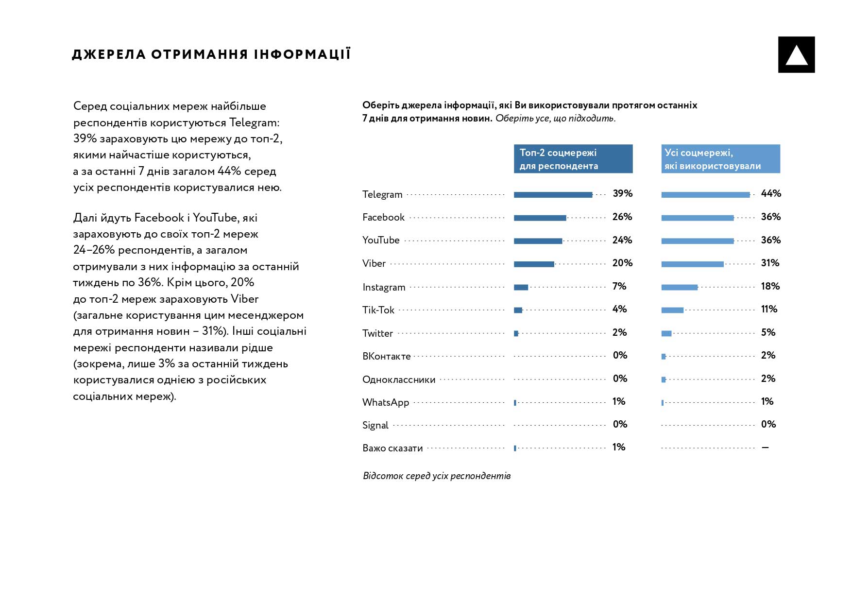 Після початку повномасштабного вторгнення росії на територію України звички споживання новин серед українців суттєво змінилися. Крім помітного переважання соціальних мереж над іншими джерелами, змінилися й переваги їх користувачів. Так, першу трійку соціальних мереж для споживання новин очолює Telegram, який уперше потрапив у топ українців — 44% респондентів споживали новини у Telegram за останні 7 днів, а 39% зараховують Telegram до топ-2 мереж, якими вони користуються. Далі йдуть Facebook і YouTube, які зараховують до своїх топ-2 мереж 24–26% респондентів, а загалом отримували з них інформацію за останній тиждень по 36%. Крім цього, 20% опитаних до топ-2 мереж зараховують Viber (загальне користування ним для отримання новин — 31%). Втім, Viber все ще переважає як месенджер для особистої комунікації. Інші соціальні мережі респонденти називали рідше (зокрема, лише 3% за останній тиждень користувалися однією з російських соціальних мереж).