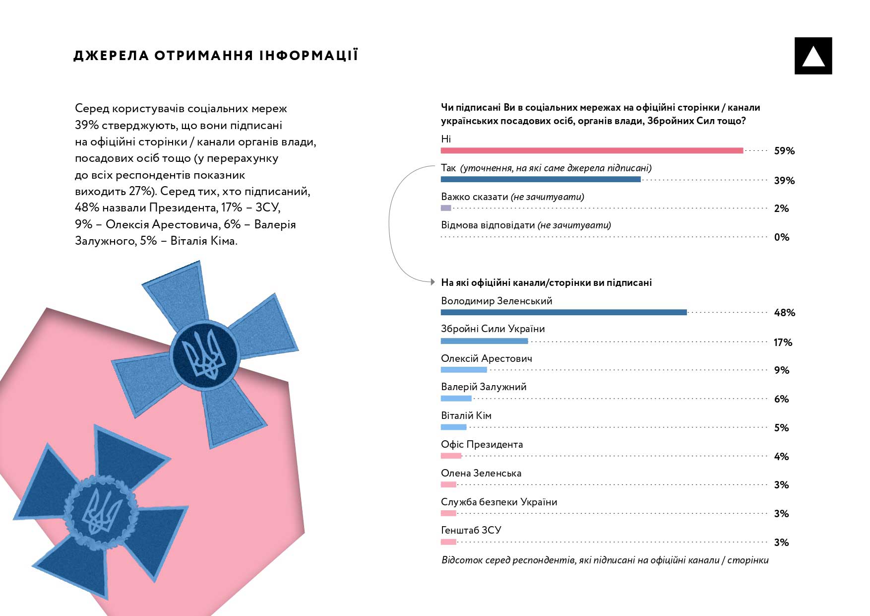 Серед користувачів соціальних мереж 39% стверджують, що вони підписані на офіційні сторінки / канали органів влади, посадових осіб тощо. Серед них 48% назвали Президента, 17% — ЗСУ, 9% — Олексія Арестовича, 6% — Валерія Залужного, 5% — Віталія Кіма.