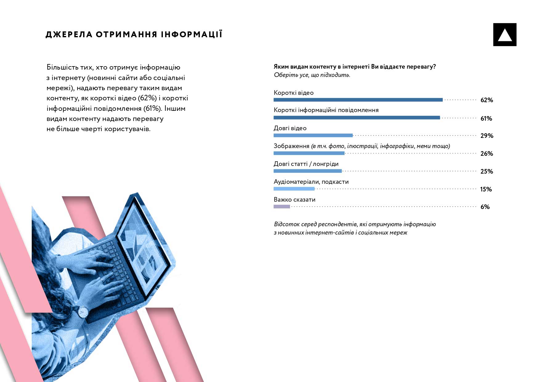 Доволі очікувано, що після початку повномасштабного вторгнення збільшилася потреба у швидкому та лаконічному інформуванні про новини на фронті, регіональні й загальнонаціональні події. Респонденти щоденникового дослідження зазначили, що надають перевагу коротким відео та інформаційним повідомленням в інтернеті (62% та 61% відповідно).