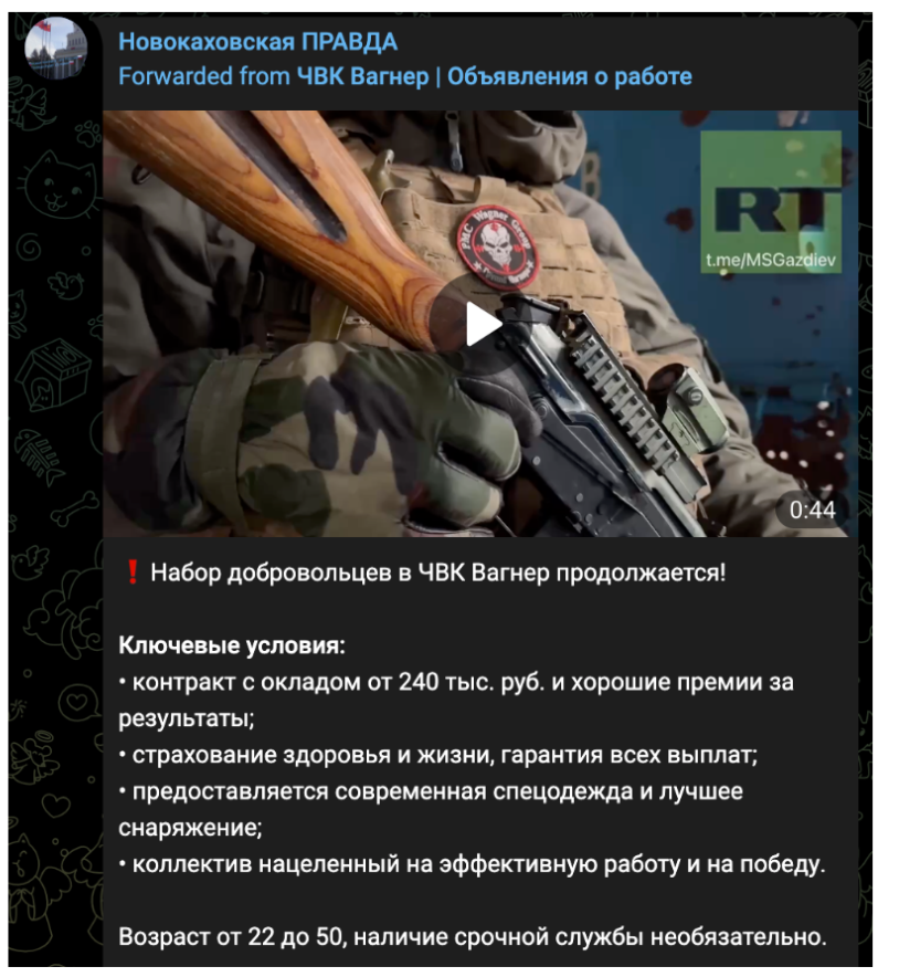 Як бачимо, окупанти радо скористалися гостинністю Телеграму для поширення пропагандистських і дезінформаційних повідомлень. Вони героїзують бойовиків, які разом з російськими збройними силами знищують українські міста й містечка та вбивають їхніх мешканців. Ба більше, нам вдалося зафіксувати спроби використання Телеграму для рекрутингу мешканців ТОТ до “Вагнера”. Те, що ПВК має змогу і, якби не спроба “заколоту”, могла б досі вільно використовувати цю платформу для розбудови власної репутації та рекрутингу найманців, є яскравим свідченням подвійних стандартів компанії щодо України.