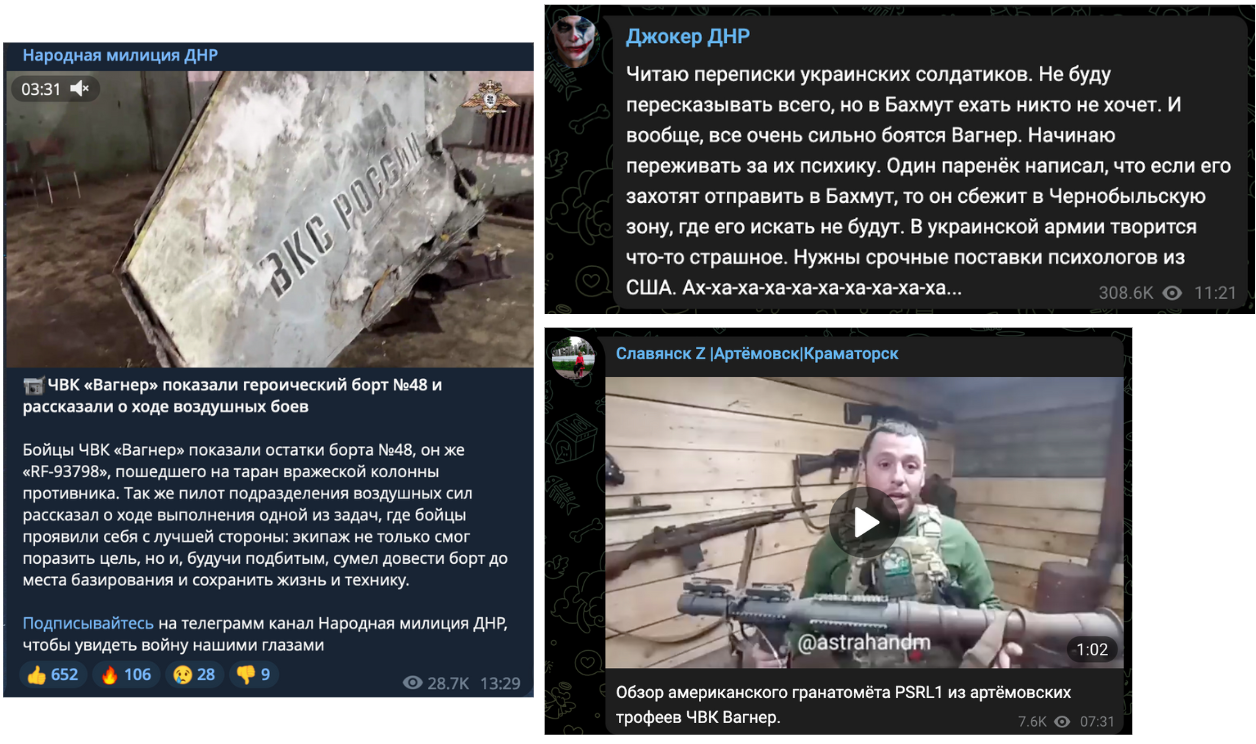 Загалом згадки “вагнерівців” у прокремлівських телеграм-каналах доволі одноманітні. Відібрані нами публікації можна узагальнити в три невигадливі наративи.
