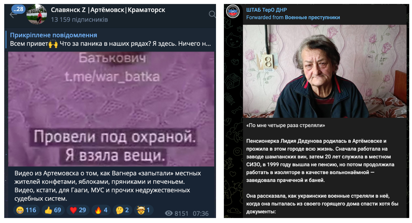 Окремий тематичний блок формують повідомлення про “милосердя” і “доброту” бойовиків до місцевого населення. Пропагандисти показують, як “вагнерівці” нібито ризикують собою, рятуючи дітей, жінок і пенсіонерів, яким, за словами росіян, ледь не “в спину стріляють” українські військові. Втім, автори таких дописів оминають увагою те, що людям не знадобилася б евакуація, якби “вагнерівці” й інші російські військові не вторглися в Україну. Окупанти записують відео, як найманці роздають дітям цукерки, чи оповідають, як особисто Пріґожин буцімто вітав українських жінок з 8 березня та відправив мешканкам одного з окупованих українських міст “вантажівку шампанського”.
