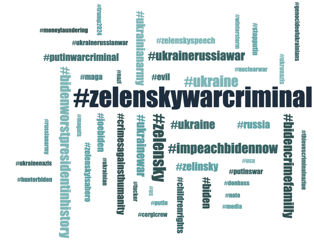 Як підрахувала Громадянська мережа ОПОРА лише за 11 годин 23 грудня користувачі опублікували понад 2,5 тисяч твітів зі згадками #ZelenskyWarCriminal англійською мовою. За даними ресурсу Socialbearing, ці твіти набрали майже 4 мільйони переглядів серед майже 2,5 мільйонів користувачів.
