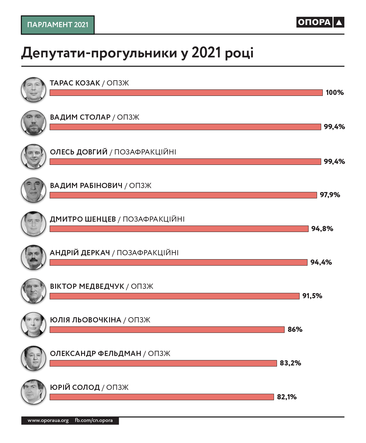 У 2021 році всі голосування пропустив депутат Тарас Козак із “Опозиційної платформи — За життя”. По 99,4% голосувань пропустив Вадим Столар з “ОПЗЖ” та Олесь Довгий (позафракційний). 97,9% голосувань пропустив Вадим Рабінович з “ОПЗЖ”, 94,8% — позафракційний Дмитро Шенцев, 94,4% — позафракційний Андрій Деркач, 91,5% — Віктор Медведчук з “ОПЗЖ”, 86% — Юлія Льовочкіна з “ОПЗЖ”, 83,2% — Олександр Фельдман з “ОПЗЖ”, 82,1% — Юрій Солод з “ОПЗЖ”.