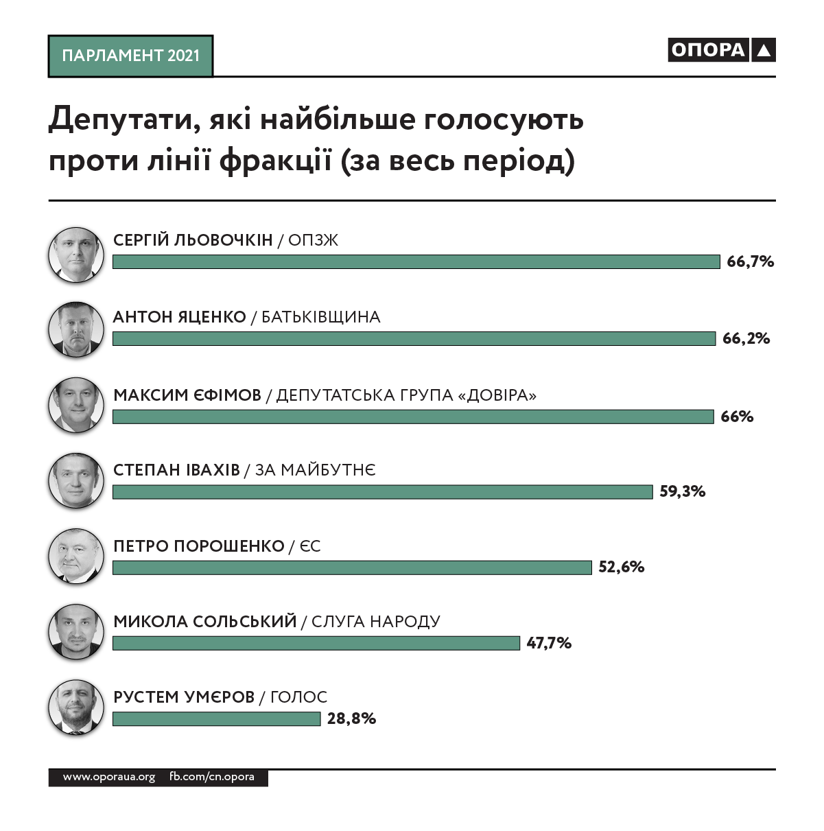 У фракції “Опозиційна платформа — За життя” найбільше усупереч із колегами голосує Сергій Льовочкін — у 66,7% випадків.