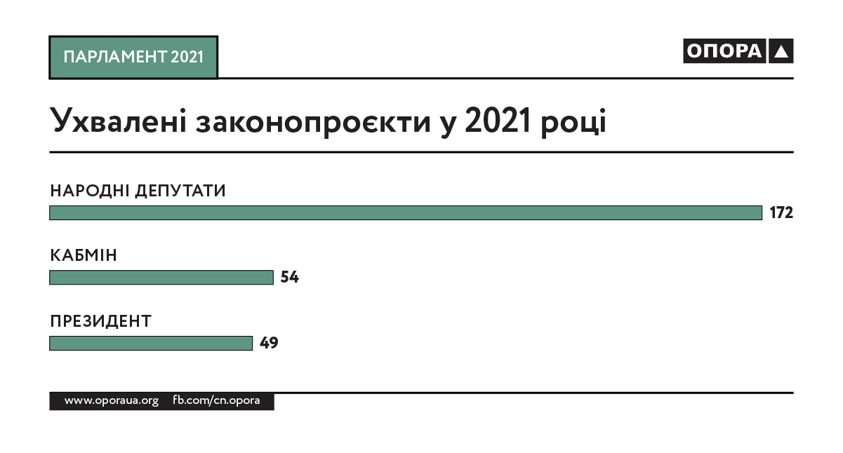 Загалом протягом 2021 року в парламенті зареєстрували 1463 проєкти законів. Для порівняння: у 2020-му їх було на 26% більше — 1851. Серед різних суб’єктів законодавчої ініціативи найбільше проєктів зареєстрували народні депутати — 1163 (79,5% від загальної кількості). На рахунку Кабміну 229 пропозицій законодавчих актів (15,7%). Президент, своєю чергою, подав 71 проєкт закону (4,9%).