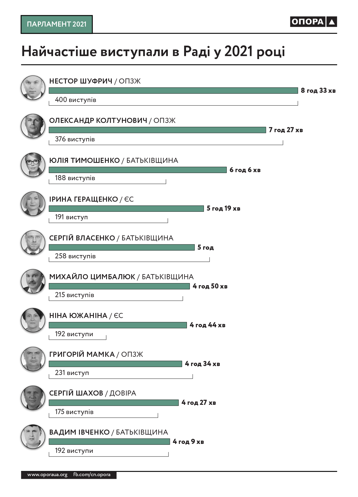 Лідерами за кількістю та загальною тривалістю виступів є опозиційні депутати. У 2021 році найдовше в парламенті виступав Нестор Шуфрич з “ОПЗЖ” — 8 годин 33 хвилини. На другому місці за цим показником — Олександр Колтунович з “ОПЗЖ”. Депутат “наговорив” 7 годин 27 хвилин. На третьому місці лідерка “Батьківщини” Юлія Тимошенко — 6 годин 6 хвилин. Далі — Ірина Геращенко з “ЄС” — 5 годин 19 хвилин, Сергій Власенко з “Батьківщини” — 5 годин, Михайло Цимбалюк з “Батьківщини” — 4 години 50 хвилин, Ніна Южаніна з “ЄС” — 4 години 44 хвилини, Григорій Мамка з “ОПЗЖ” — 4 години 34 хвилини, Сергій Шахов з групи “Довіра” — 4 години 27 хвилин, Вадим Івченко з “Батьківщини” —  4 години 9 хвилин.