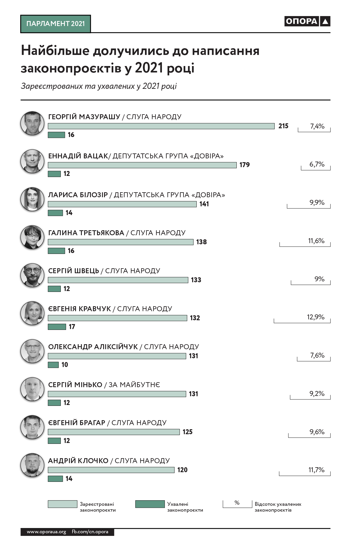 Георгій Мазурашу зі “Слуги народу” став співавтором 215 проєктів законів, Геннадій Вацак з групи “Довіра” — 179, Лариса Білозір із цієї ж групи — 141, Галина Третьякова з “Слуги народу” — 138, а її колега по фракції Сергій Швець — 133. На рахунку Євгенії Кравчук (“Слуга народу”) 132 ініціативи, Олександра Аліксійчук (“Слуга народу”) — 131, ​​Сергія Мінька (“За майбутнє”) — 131, Євгенія Брагара (“Слуга народу”) — 125, Андрія Клочка (“Слуга народу”) — 120. Проте в середньому лише кожен 10-й законопроект найбільших законотворців був ухвалений.