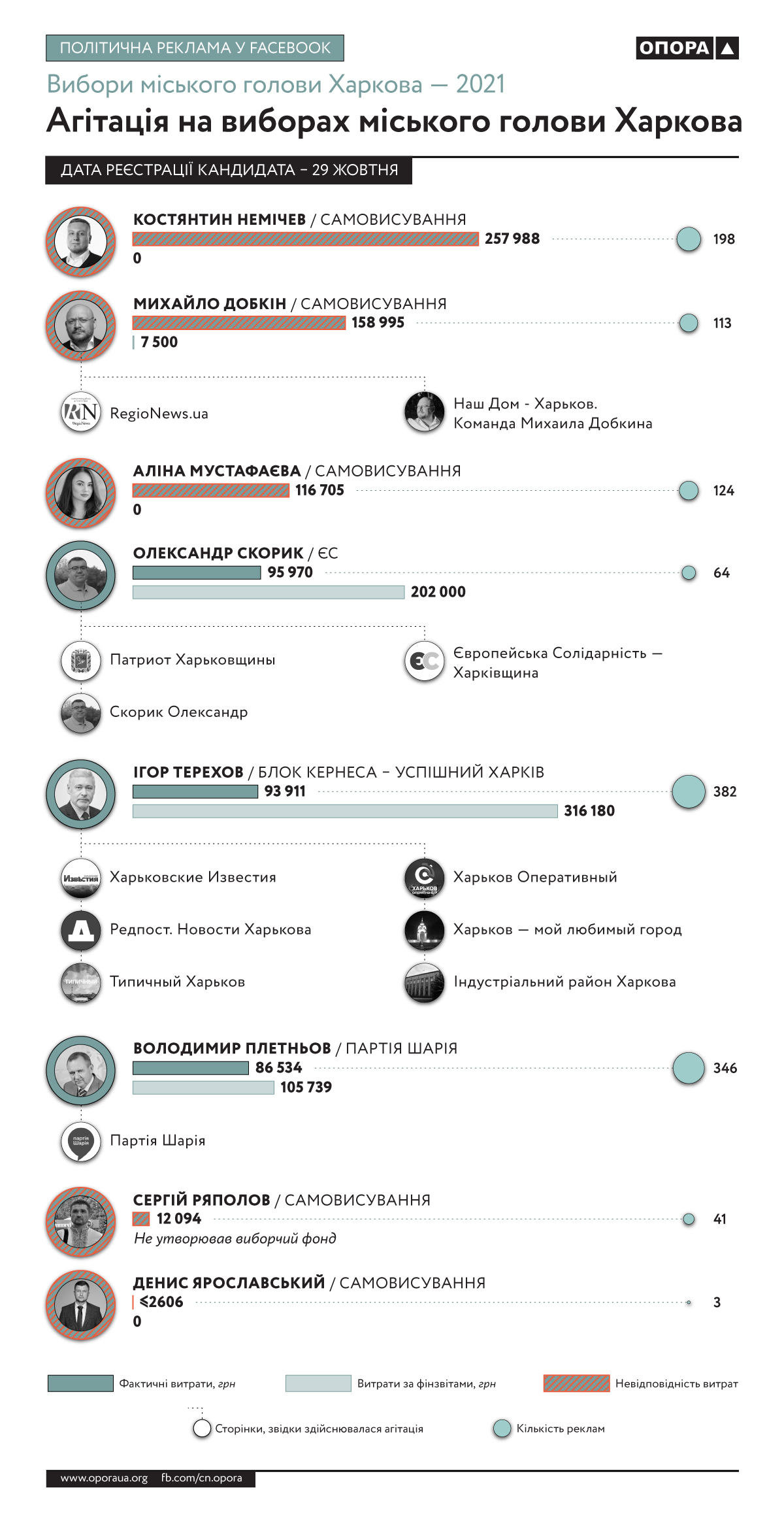 Так відбулося і на виборах міського голови Харкова: за даними ОПОРИ, 6 кандидатів (Ігор Терехов, Михайло Добкін, Аліна Мустафаєва, Костянтин Немічев, Олександр Скорик, Сергій Ряполов) розпочали рекламну активність ще до старту виборчої кампанії. Найбільше коштів було витрачено на дочасну агітацію за Ігоря Терехова — політична реклама на його користь виходила на 19 сторінках, які сумарно витратили близько 740 тисяч гривень. Також активно використовували дочасну агітацію в соціальних мережах Михайло Добкін (витрачено близько 650 тисяч гривень) та Аліна Мустафаєва (витрачено близько 378 тисяч гривень).
