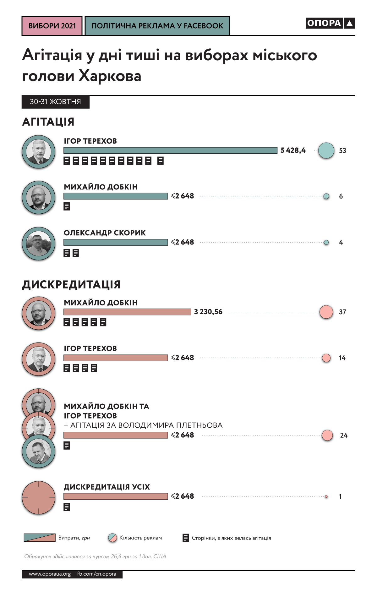 Дискредитаційні дописи у “дні тиші” поширювалися дещо активніше. ОПОРА зафіксувала 5 сторінок, які витратили на дискредитацію Михайла Добкіна щонайменше 122 долари США. Інші 4 сторінки поширювали інформацію проти Ігоря Терехова, витративши менше 100 доларів США кожна. Варто відзначити й сторінки Регион ИНФО - новости твоего региона та Идеальный мэр, які діяли подібно до того, як вони функціонували протягом передвиборчої кампанії: перша дискредитувала у “дні тиші” Ігоря Терехова та Михайла Добкіна, друга — і їх, і всіх інших кандидатів.