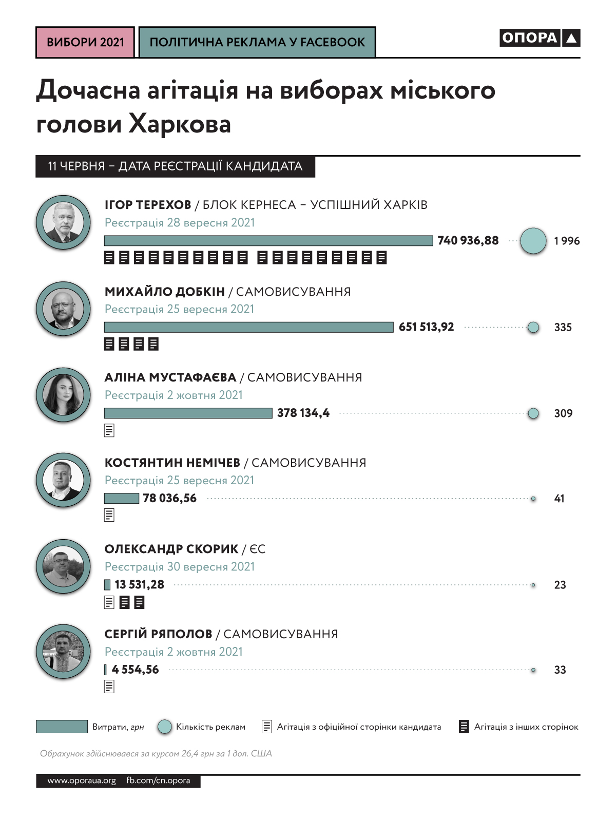 Крім того, ОПОРА виявила щонайменше 6 сторінок, що негативно висвітлювали діяльність Ігоря Терехова і за час передвиборчої кампанії витратили на просування своїх дописів майже 7300$ (193 тисячі гривень). Принаймні 3 сторінки з цих 6 (ОбнажёнKha, Дичь Харькова та Цена вопроса), відповідно до розслідування ОПОРИ, входили до координованої мережі та активно використовували фейкові облікові записи для дискредитації Ігоря Терехова.