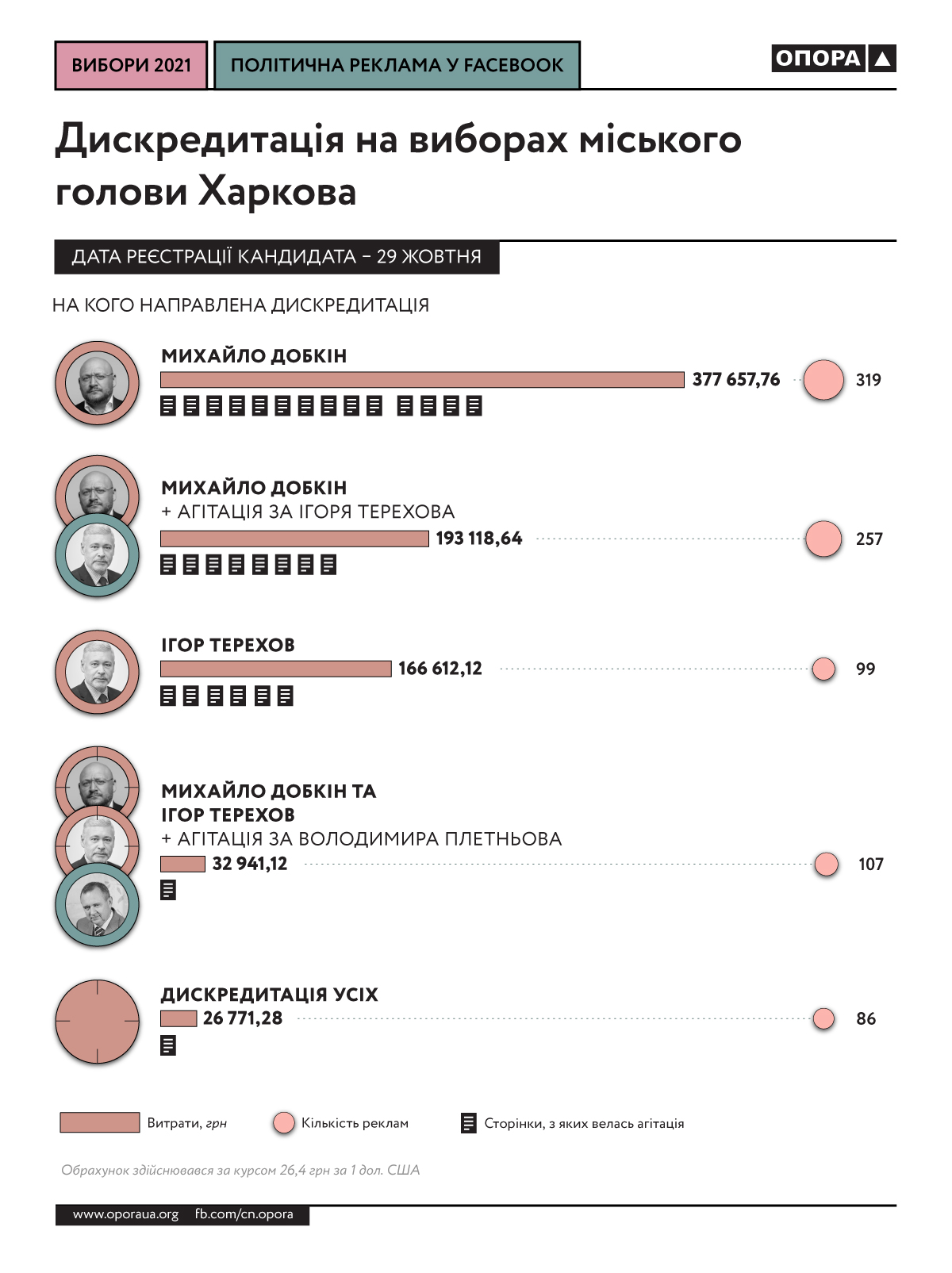 Крім позитивних повідомлень, які закликали виборців віддати голос за того чи іншого кандидата, ОПОРА також виявила низку сторінок, що дискредитували учасників виборів у Харкові — переважно Михайла Добкіна та Ігоря Терехова. Показово, що часто ці сторінки поєднували рекламну й дискредитаційну діяльність: наприклад, активно публікуючи дописи проти Михайла Добкіна, вони підтримували Ігоря Терехова і навпаки. Дискредитаційна кампанія на цьогорічних виборах була масштабною: сукупно із 30 дискредитаційних сторінок за період передвиборчої кампанії було витрачено 30 102 доларів США (понад 798 тисяч гривень) на трансляцію рекламних повідомлень.