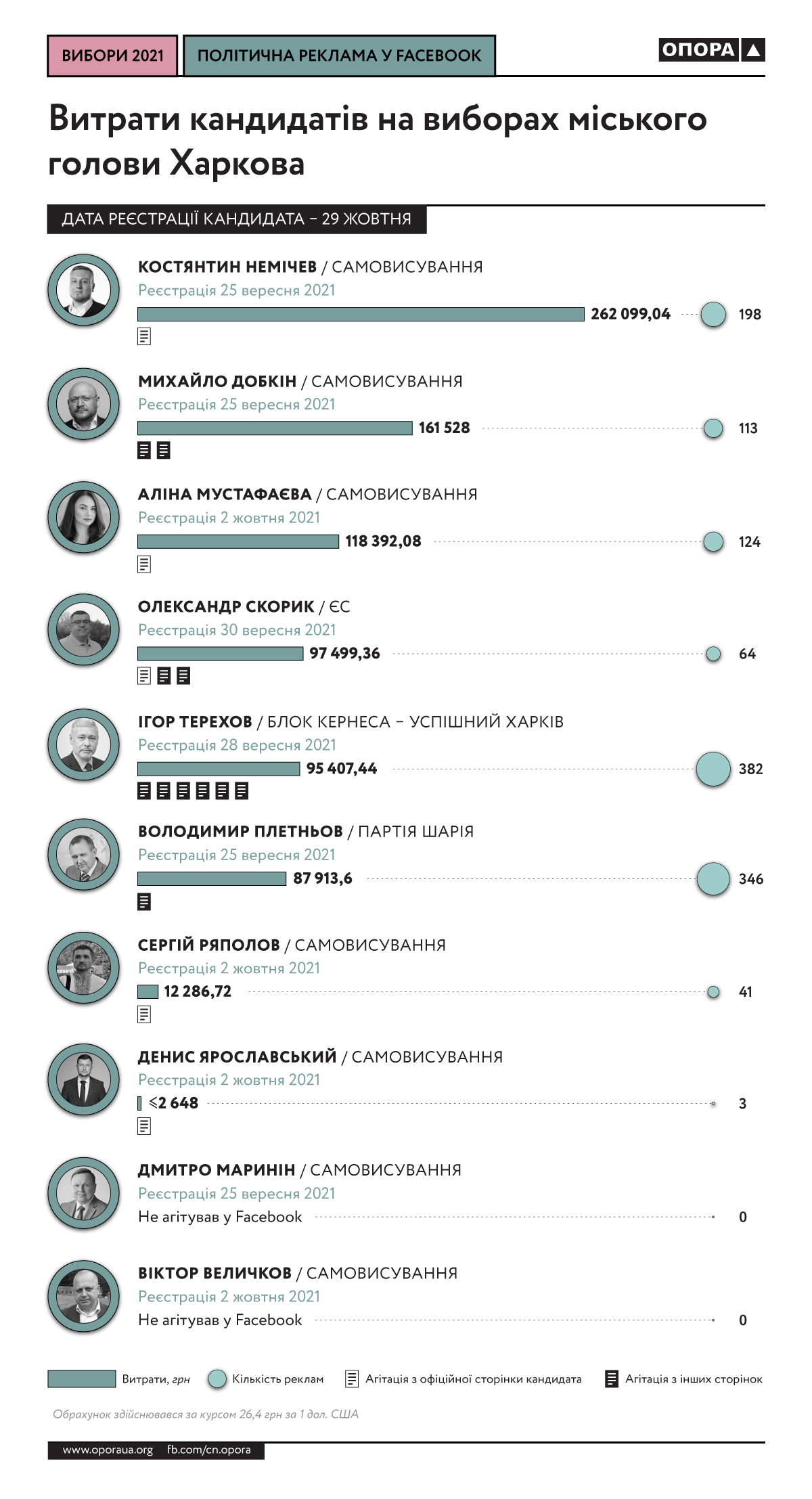 З 8 кандидатів, які здійснювали агітацію у соціальній мережі Facebook, лише троє (Олександр Скорик, Ігор Терехов та Володимир Плетньов) відобразили у звітах більші витрати на неї, ніж ті, що їх виявила ОПОРА під час моніторингу. Це означає, що ці кандидати також здійснювали агітацію й на інших платформах, однак через особливості українського виборчого законодавства та політику самих інтернет-платформ відстежити, на що пішли ці витрати, фактично неможливо. Попри це, не обійшлося й без відвертих порушників. Так, Михайло Добкін, хоч і вказав у звіті, що витратив на агітацію в інтернеті 7500 гривень, насправді інвестував близько 160 тисяч гривень лише на трансляцію рекламних повідомлень у Facebook. Водночас Аліна Мустафаєва, Костянтин Немічев та Денис Ярославський взагалі не задекларували у фінансових звітах будь-яких витрат на рекламу в глобальній мережі, хоч агітували вони доволі активно. Також варто відзначити, що Сергій Ряполов, який витратив на політичну рекламу у Facebook близько 12 тисяч гривень, не створював виборчого фонду і не подавав до харківської ТВК фінансової звітності.
