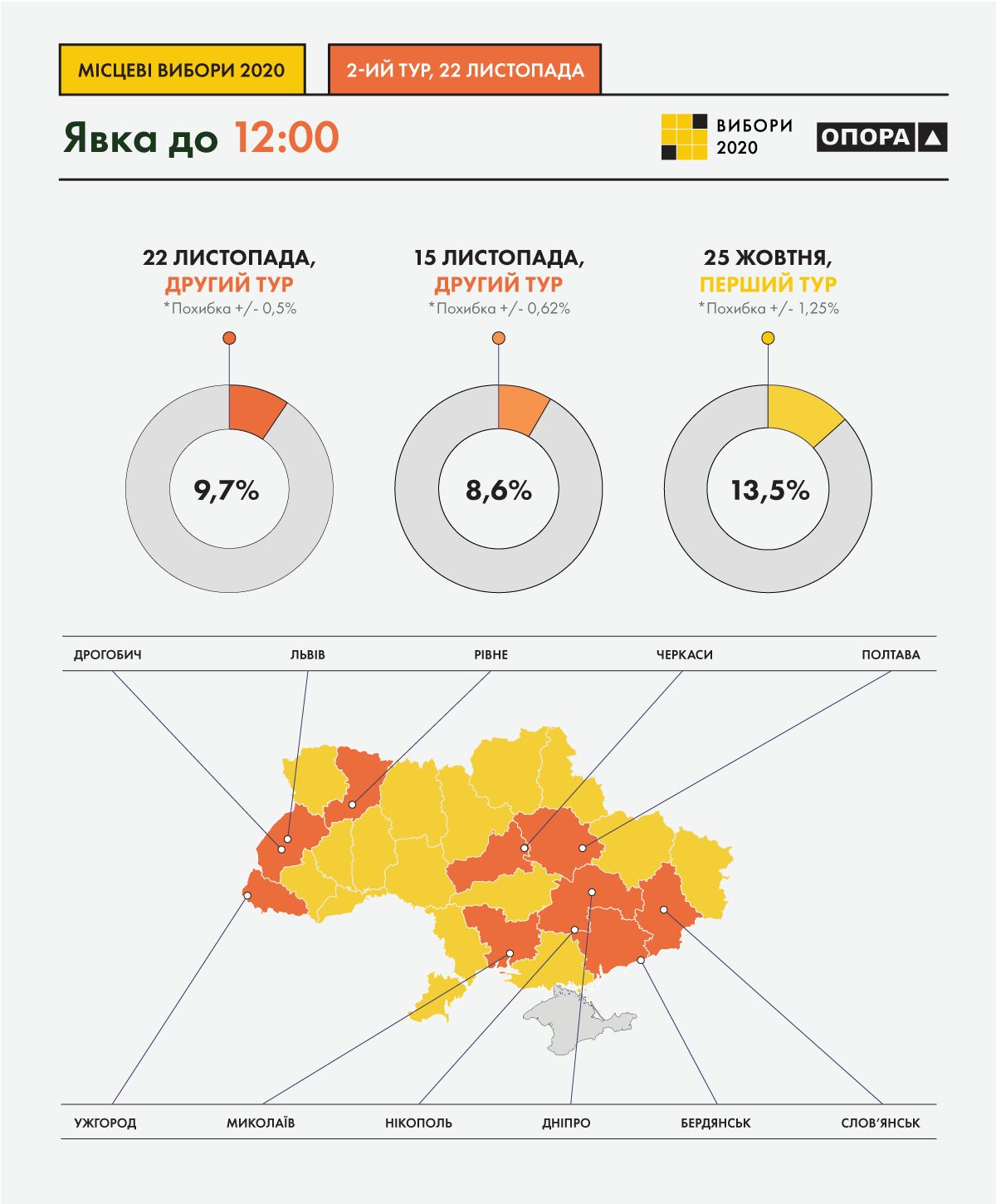 За інформацією від спостерігачів ОПОРИ, під час повторного голосування 22 листопада інтегрована явка виборців у 11 містах о 12:00 склала 9,7% (похибка складає 0,5%). Для порівняння, під час голосування 25 жовтня по всій Україні на цей час явка становила 13,5%. Під час повторного голосування 15 листопада явка виборців у 7 містах на цю ж годину склала 8,6%.