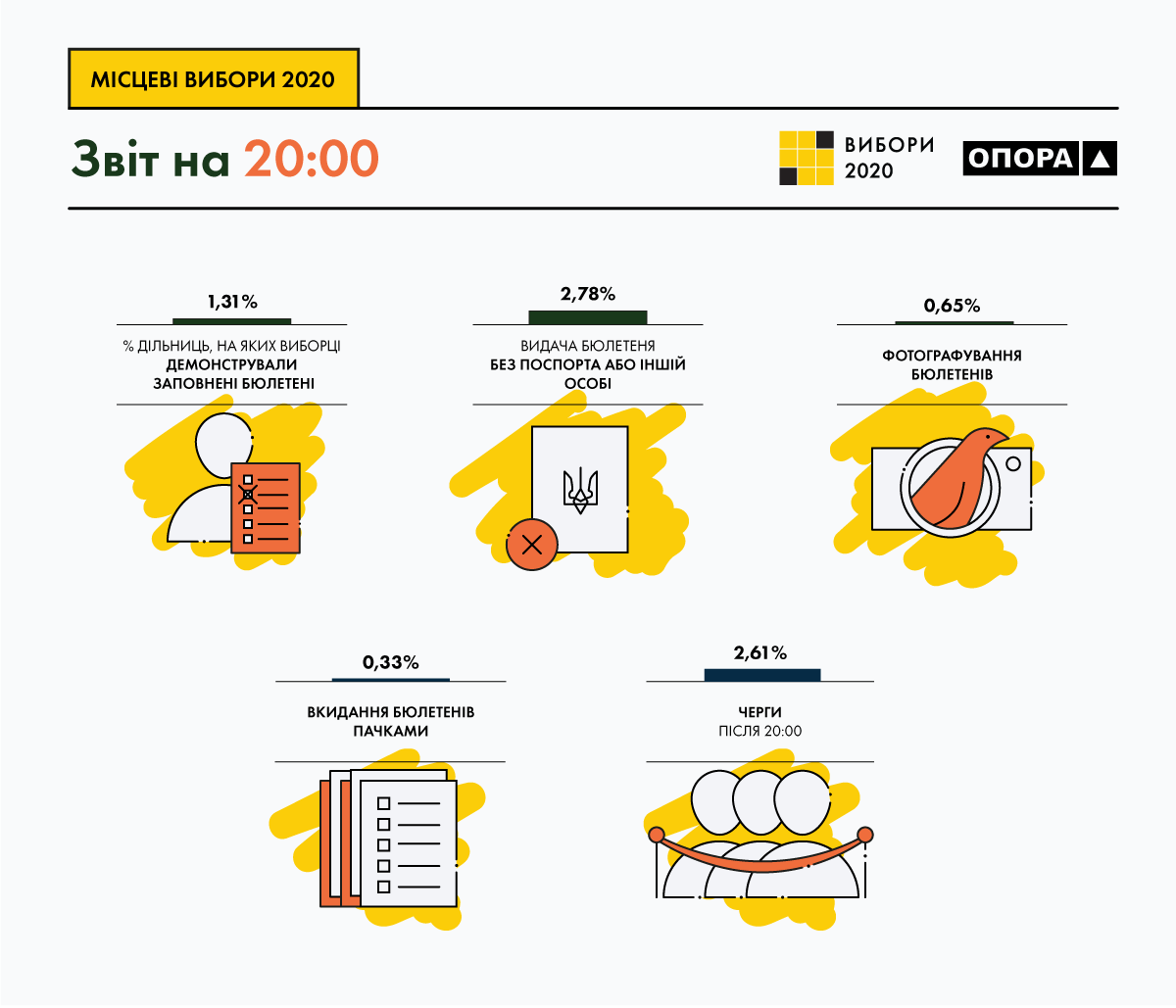ОПОРА продовжувала слідкувати за перебігом процесу голосування в останніх декілька годин, що передували закриттю виборчих дільниць. В проміжку між 16:00 і 20:00 годинами за оцінками спостерігачів робота виборчих комісій стала більш організованою, а кількість типових процедурних порушень зменшилася. Голосування завершилося в звичному режимі і станом на 20:00 на 97,4% дільниць не спостерігалося черг з виборців, тоді як на 2,6% ДВК такі черги фіксувалися. Станом на 20:00, так само як і впродовж попередніх годин голосування, статистично значущих випадків незаконного вкидання бюлетенів в виборчі скриньки виявлено не було. Лише на 0,33% ДВК такі спроби мали місце.