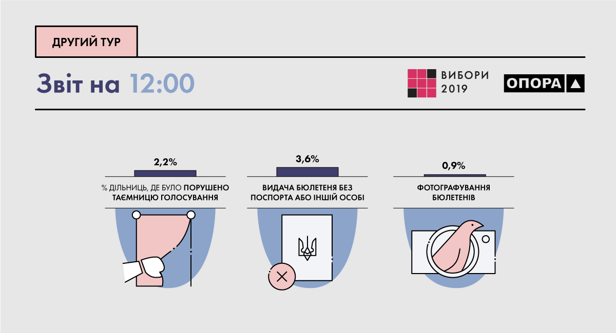 У порівнянні із першим туром голосування та позачерговими виборами Президента України, ОПОРА констатує зменшення інтенсивності порушень, вчинених суб’єктами виборчого процесу між 08 та 12 годинами дня голосування. Це може засвідчувати належну організацію голосування та профілактичну роль попередніх зусиль Національної поліції України у сфері протидії, виявлення та розслідування виборчих злочинів.