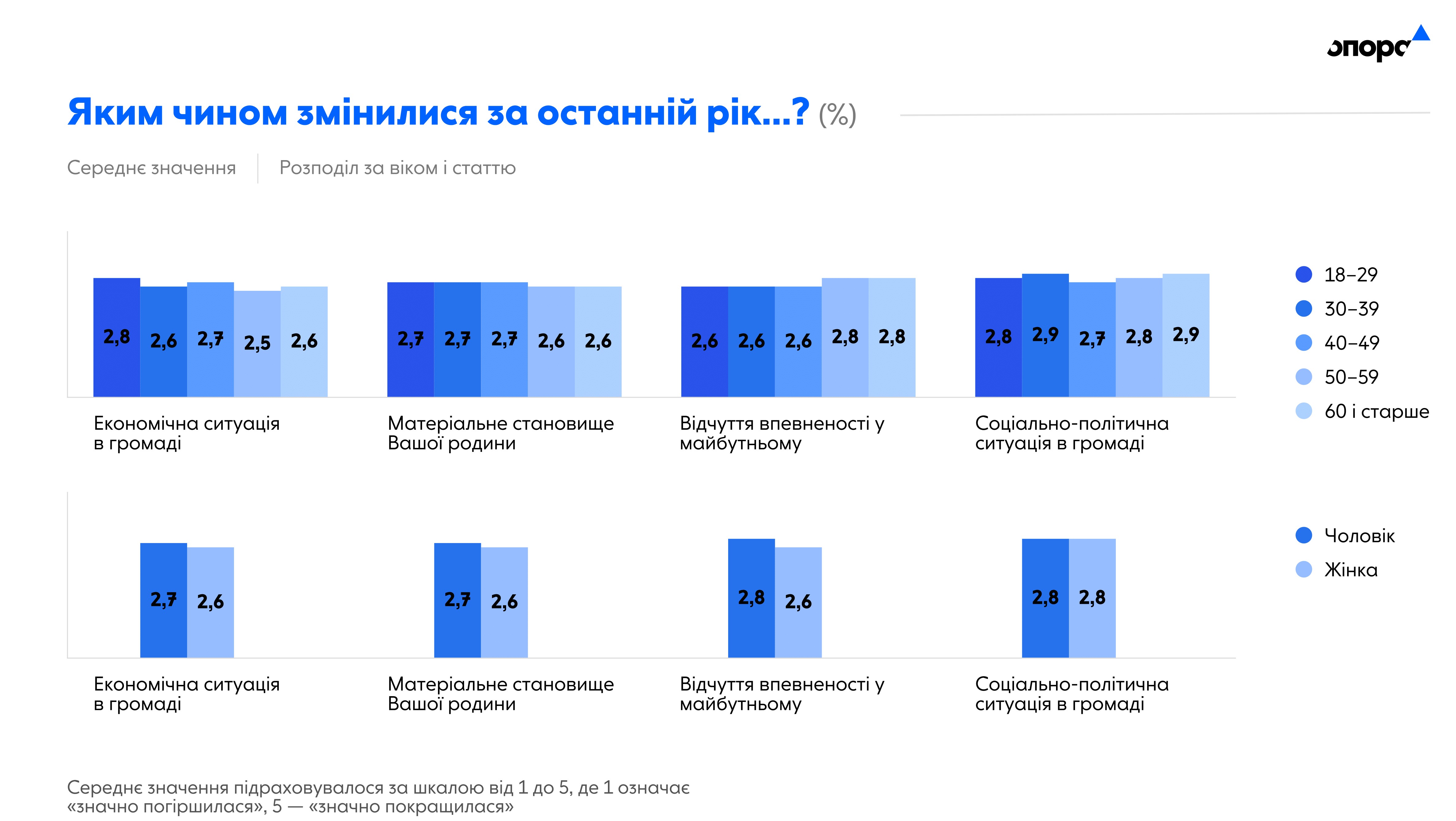 Більшість опитаних вважають, що за останній рік ситуація у громаді в різних сферах не змінилася. 24% вказали, що соціально-політична ситуація погіршилася, а 13% — покращилася. Відчуття впевненості у майбутньому в 40% опитаних погіршилося, у 16% — покращилося. Більш високі показники фіксуються серед людей старшого віку та чоловіків. Матеріальне становище власної родини погіршилося у 25% опитаних, а в 11% — покращилося. 35% вказали на погіршення економічної ситуації у громаді, 13% — на її покращення. Більшості опитаних (78%) комфортно проживати у громаді, ще 36% хотіли б, щоб у ній проживали їхні діти. Таку думку частіше поділяють старші опитані, натомість молодь частіше схиляється до варіантів переїзду (свого або своїх дітей) за межі громади.