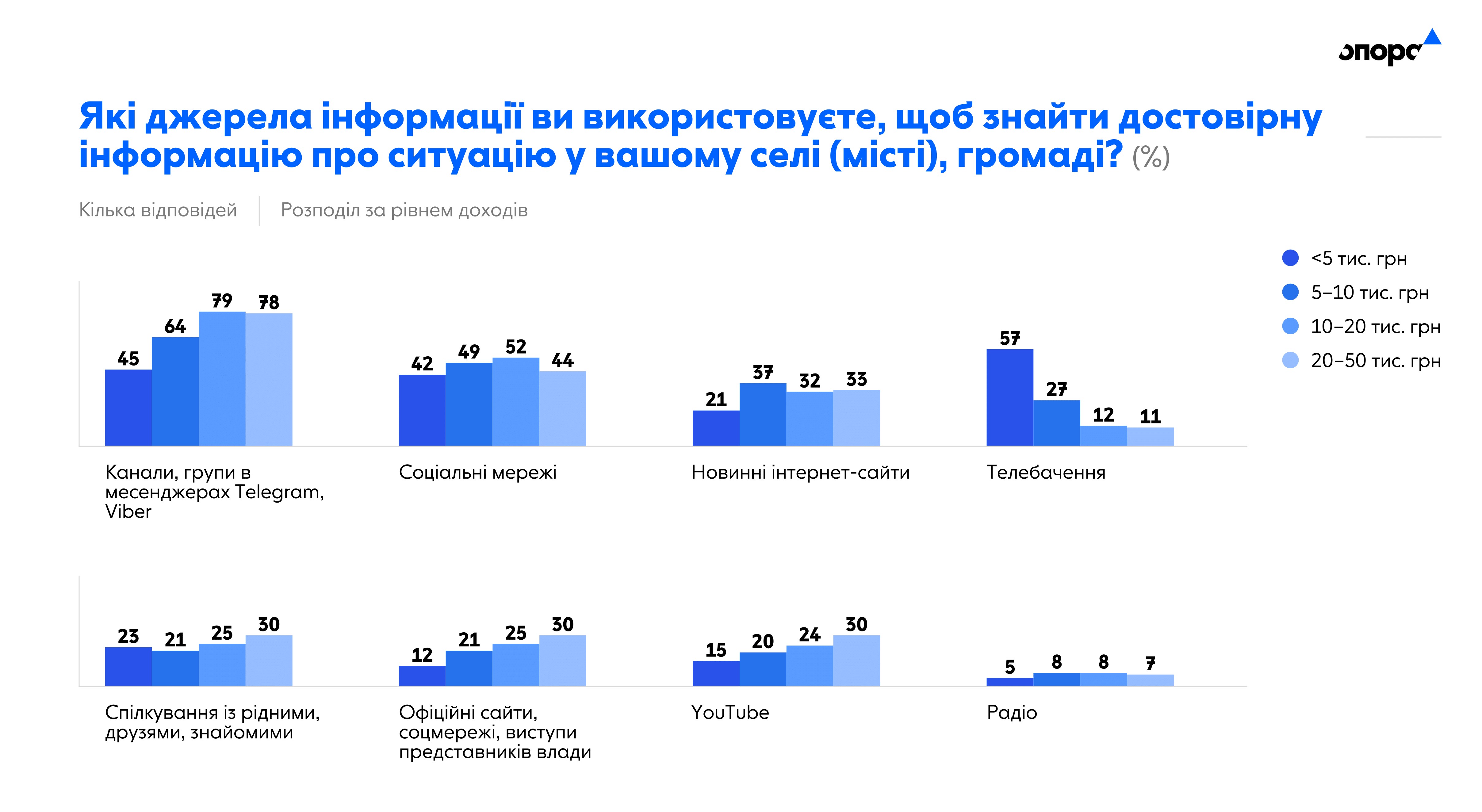 60% опитаних певною мірою цікавить місцева політика, для 23% вона зовсім не цікава, 18% виявляють до неї значний інтерес. 74% респондентів зазначили, що можуть помітити маніпуляції чи неправдиву інформацію, коли отримують новини. Складніше це виявилося для людей старшого віку та мешканців міста. Основні джерела інформації про ситуацію в громаді — канали та групи у Telegram і Viber (64%) та інші соціальні мережі (47%). Канали та групи у Telegram і Viber популярніші серед молоді, жінок, людей з вищими доходами; соціальні мережі — серед людей середнього віку та середнього достатку, натомість телебачення — серед старших людей, чоловіків та найбідніших. З офіційних сайтів, соцмереж, YouTube також споживають інформацію респонденти з вищими доходами і молодші.