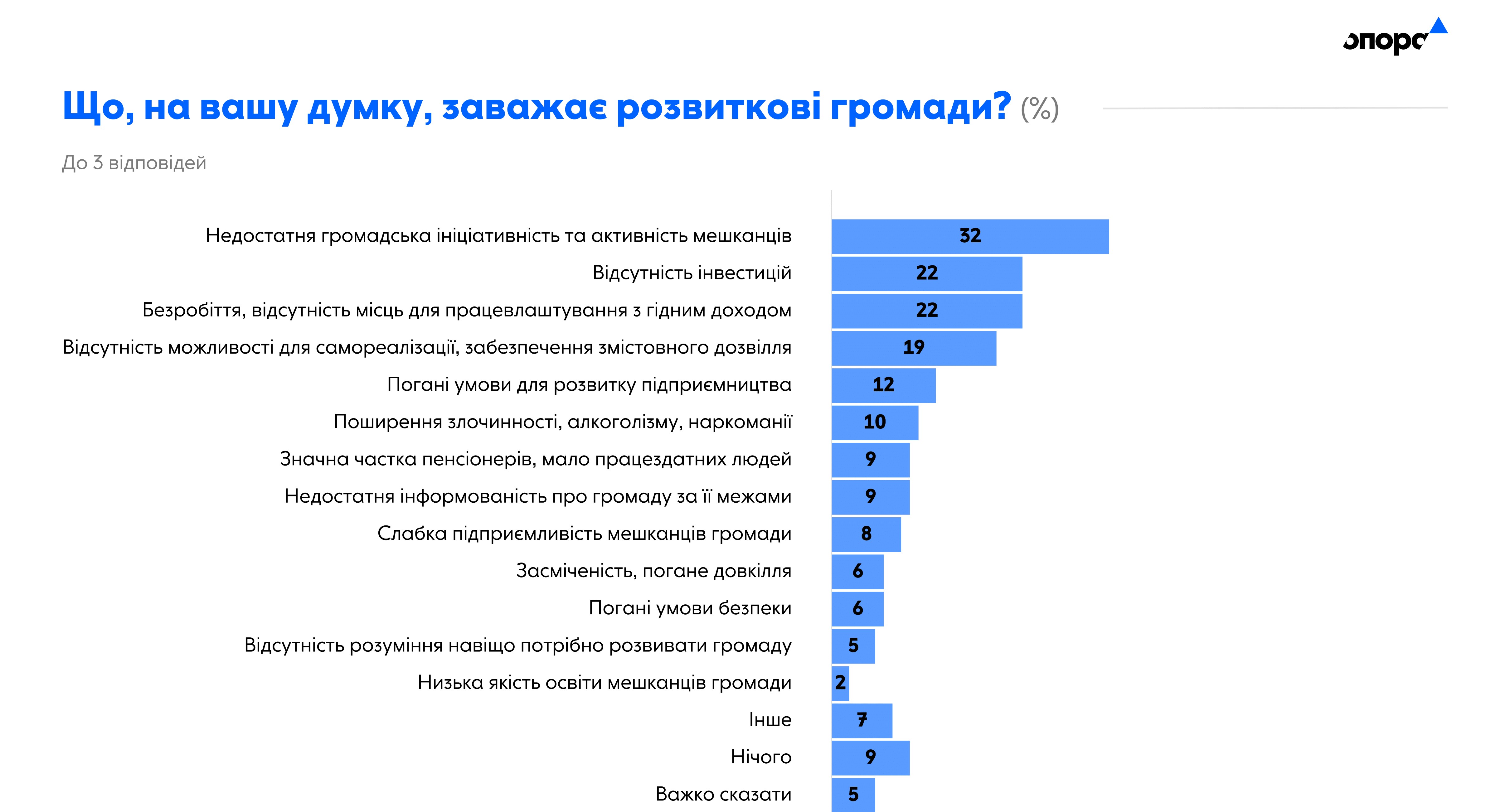 67% опитаних задоволені життям у своїй громаді (переважно це мешканці сіл), 6% дотримуються протилежної думки. Пріоритетами розвитку громади опитані вважають програми допомоги військовослужбовцям та їхнім родинам (45%), створення робочих місць (34%) і покращення енергетичної інфраструктури (32%). Містяни частіше вказували на пріоритетність покращення енергетичної інфраструктури й комунальної сфери. Агентами розвитку громади респонденти вважають молодь (63%) та військових і ветеранів (46%). Молодь частіше називала акторами змін своїх однолітків, підприємців, волонтерів, іноземні інституції. Відповідальність за напрацювання планів розвитку громади, як і контроль за використанням коштів на відновлення і розвиток старші опитані переважно покладають на місцеву владу — 68% і 39% відповідно. Натомість молодь частіше згадує про роль місцевих державних адміністрацій.