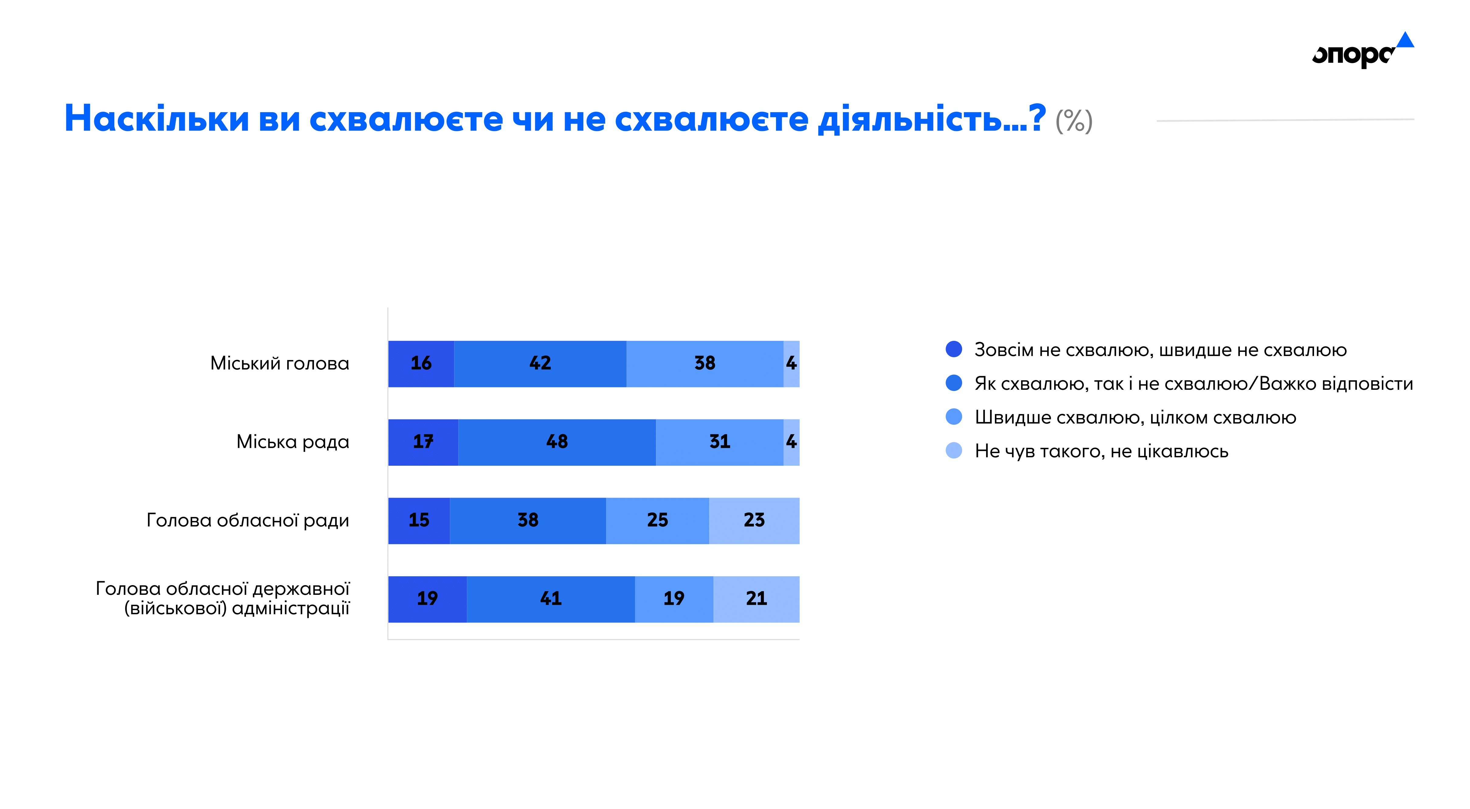 Більшість опитаних (від майже 40% до 50%) має нейтральну оцінку схвалення діяльності місцевої влади. Старші опитані та мешканці сіл позитивніше оцінюють її діяльність. Діяльність міського голови скоріше схвалюють 38% опитаних (16% — не схвалюють, 42% і схвалюють, і не схвалюють). Діяльність міської ради схвалюють 31% (17% — не схвалюють, 48% — і схвалюють, і не схвалюють). Діяльність Голови обласної ради схвалюють 25%, 15% — не схвалюють, 38% і схвалюють, і не схвалюють. Діяльність Голови обласної державної адміністрації схвалюють 19%, стільки ж (19%) – не схвалюють, 41% — і схвалюють, і не схвалюють. Перш за все, на думку респондентів, кошти міського бюджету мають спрямовуватися на військову сферу (64%) та підтримку чинних військовослужбовців, ветеранів і їхніх сімей (48%). Молодь частіше зазначає про необхідність збільшення витрат на медицину, культуру, освіту й облаштування укриттів. Чоловіки частіше говорять про необхідність підготовки до зими. Про підтримку чинних військовослужбовців частіше зазначали ті, хто має родичів у ЗСУ.