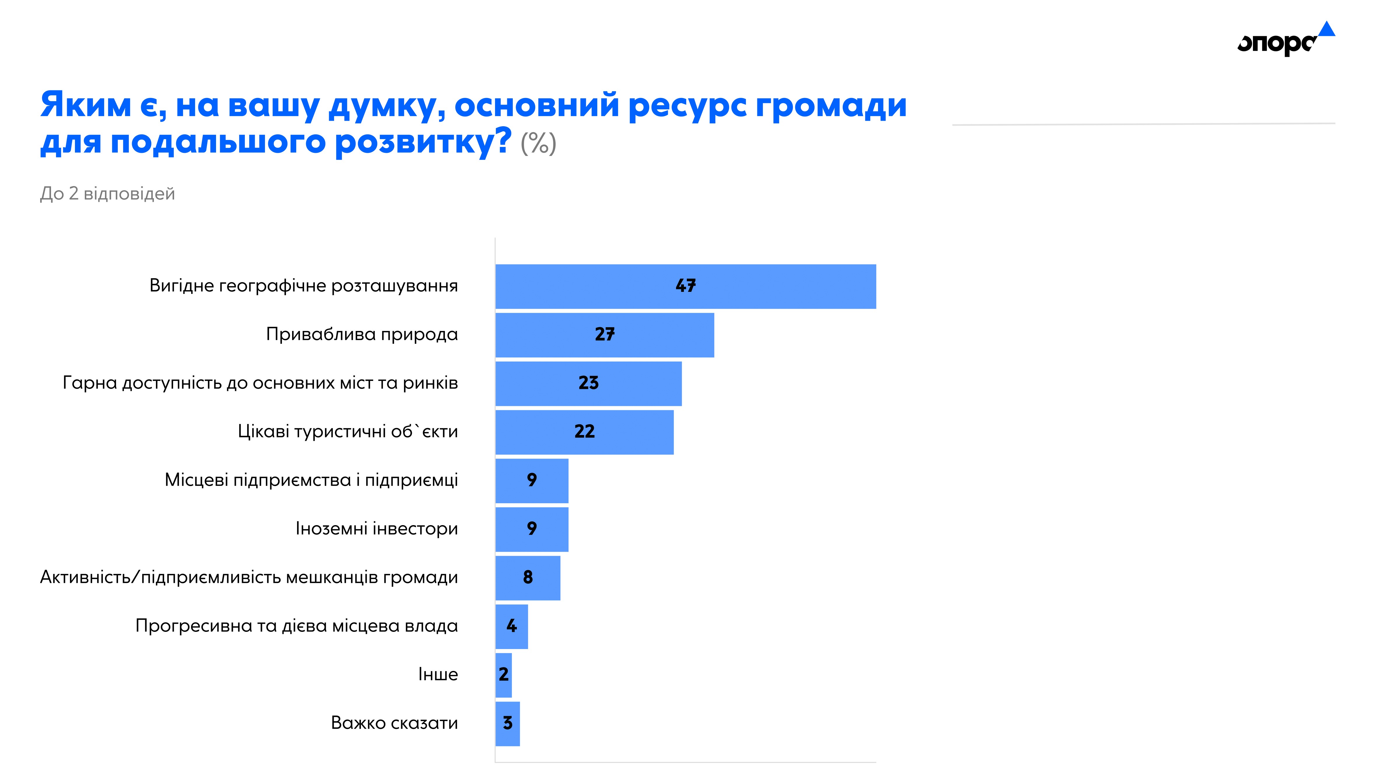 Найбільше опитані задоволені умовами безпеки в громаді (46%). Можливостями заробітку задоволені 33%, професійної реалізації — 34%, можливостями для заняття підприємництвом — 29%. Молодь дещо краще оцінює можливості заробітку, містяни — можливість професійної реалізації. Основними бар’єрами у розвитку громади опитані вважають недостатню громадську ініціативність мешканців (32%), причому цю проблему частіше згадували мешканці мість. Іншими бар’єрами є відсутність інвестицій та безробіття (по 22%) та можливостей для самореалізації (19%), про що частіше зазначали мешканці сіл. Основним ресурсом громади для розвитку вважають її вигідне географічне розташування (47%), природу (27%), доступність до міст і ринків (23%) та туристичні об’єкти (22%). Містяни частіше згадували про туристичні об’єкти й іноземних інвесторів, мешканці сіл — про гарну доступність до міст та ринків.